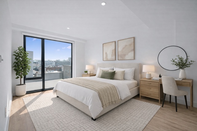 Additional highlights include multi-zone heating and cooling, in-unit GE washer and dryer, ample closet space, recessed LED lighting, custom window treatments, and a Bluetooth-enabled Akuvox virtual doorman system. Select residences offer private outdoor space.