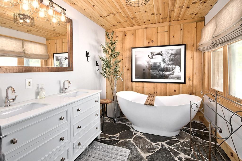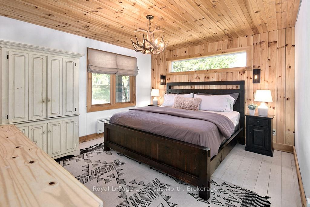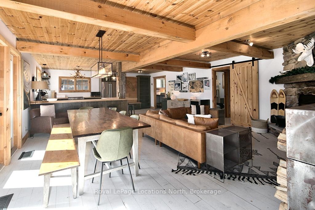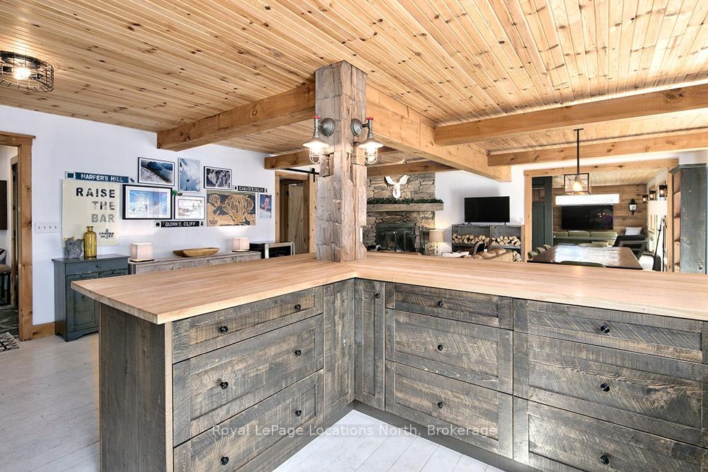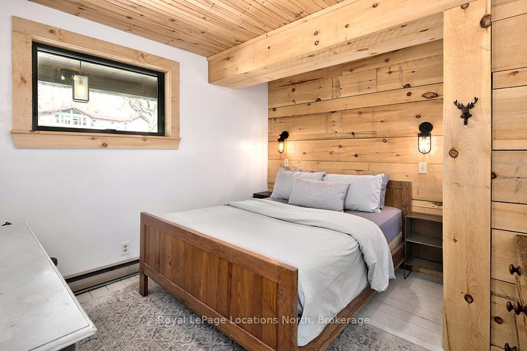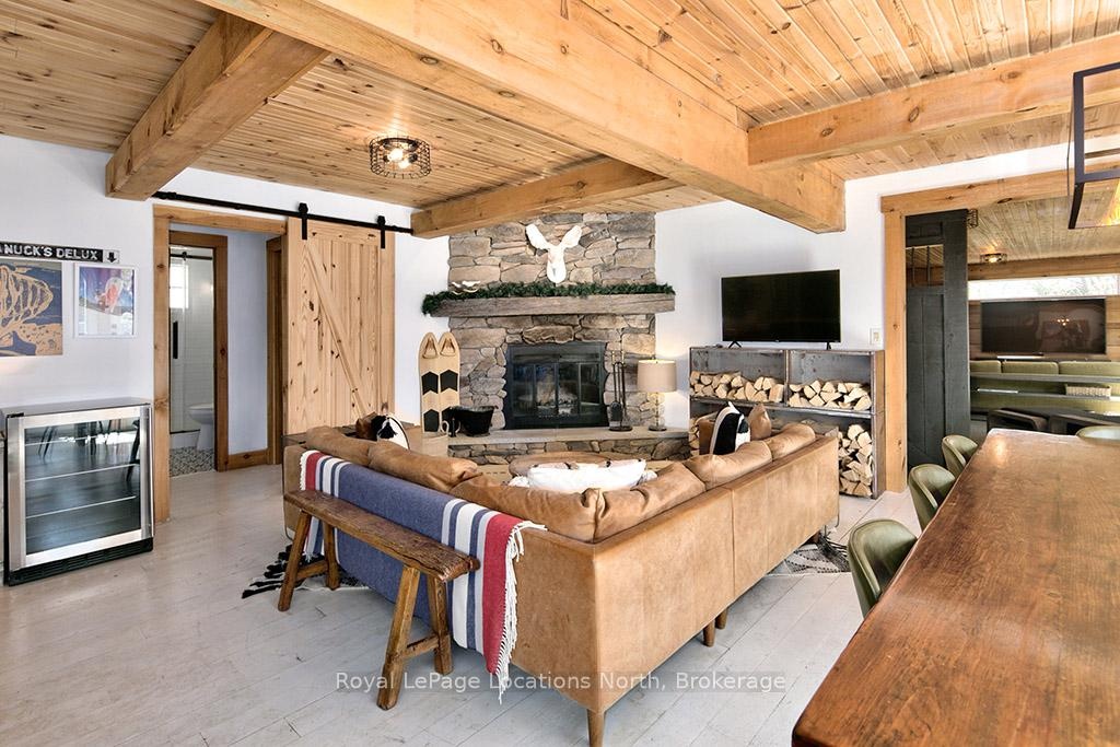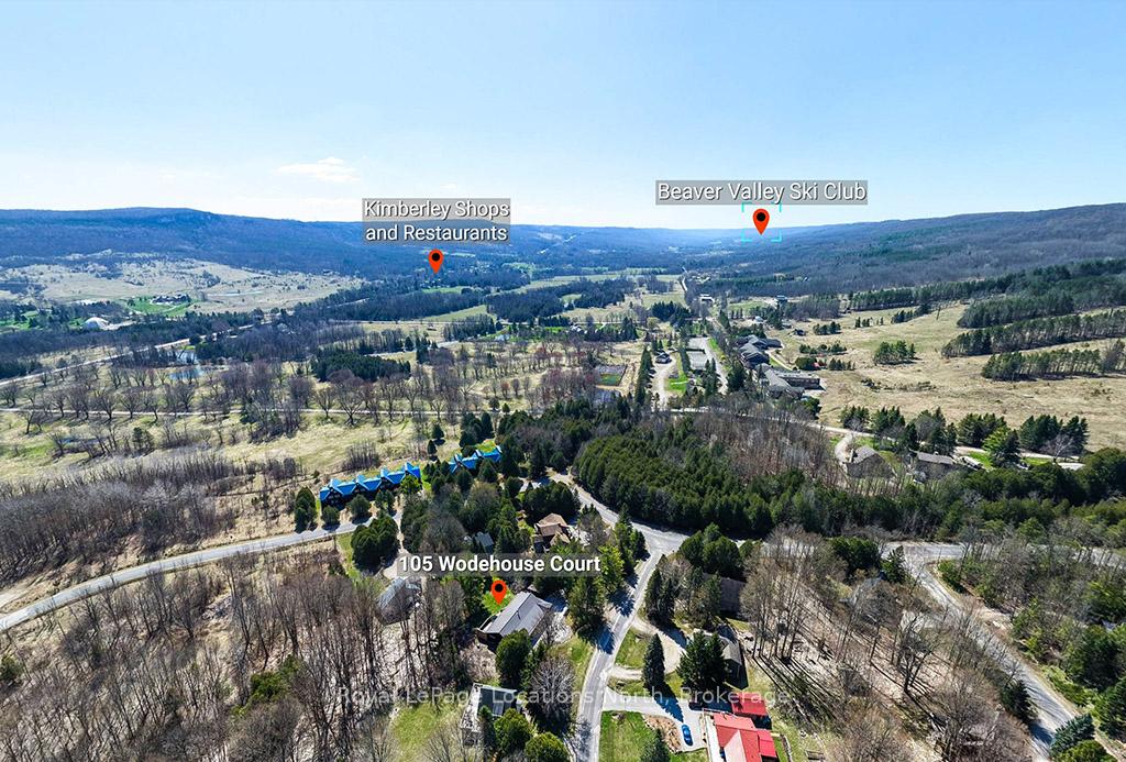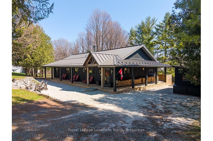 Welcome to 105 Wodehouse Court, a sophisticated ranch-style bungalow that perfectly balances modern designer living with soul-warming cabin comfort. Located on a private half-acre lot just minutes from the Beaver Valley Ski Club, this home makes a striking first impression with its black board-and-batten exterior and expansive wrap-around porch. Inside, the heart of the home is a sprawling open-concept living area where massive exposed beams and wood-plank ceilings frame a stunning floor-to-ceiling stone fireplace. The layout is thoughtfully designed for both connection and the ability to separate into unique zones if necessary, providing a seamless transition between social gatherings and quiet privacy. Whether you are hosting a dinner party in the designer kitchen with its live-edge accents or enjoying a slow morning by the fire, the home adapts to your lifestyle. To ensure total comfort, the foyer and bathrooms feature radiant heated flooring, offering a warm welcome after a day in the snow. The primary suite serves as a dedicated sanctuary, highlighted by a breathtaking ensuite bathroom. Here, a deep, sculptural freestanding soaker tub sits as a centerpiece against rugged flagstone flooring and natural wood walls, offering the ultimate spa-like escape to recharge. With three bedrooms and three bathrooms in total, there is ample space for family and friends to find their own corner of calm. Living here is entirely effortless. The property is being sold absolutely turnkey with all high-end furniture and curated decor included. For the outdoor enthusiast, a separate dedicated shed serves as a professional-grade gear hub for storage and ski tuning. Combined with the rare convenience of municipal water and sewer, this property offers a low-maintenance, high-style retreat in the heart of the Valley. Just pack your bags, grab your skis, and welcome home.
