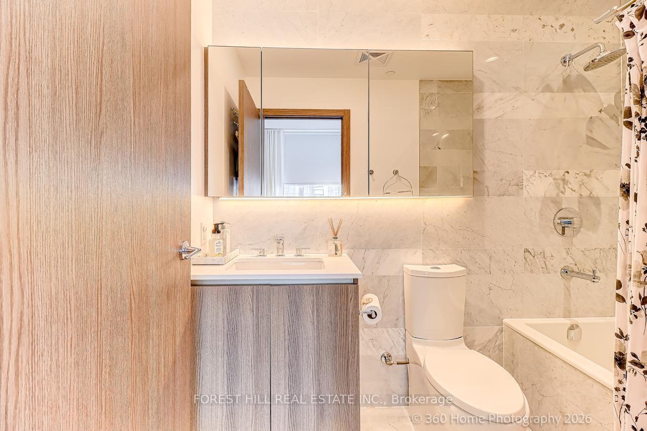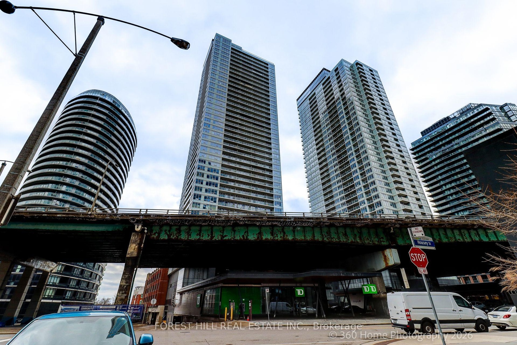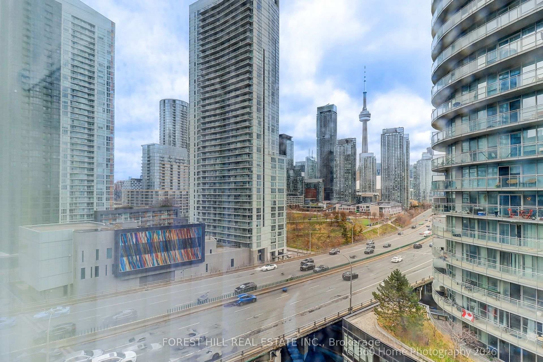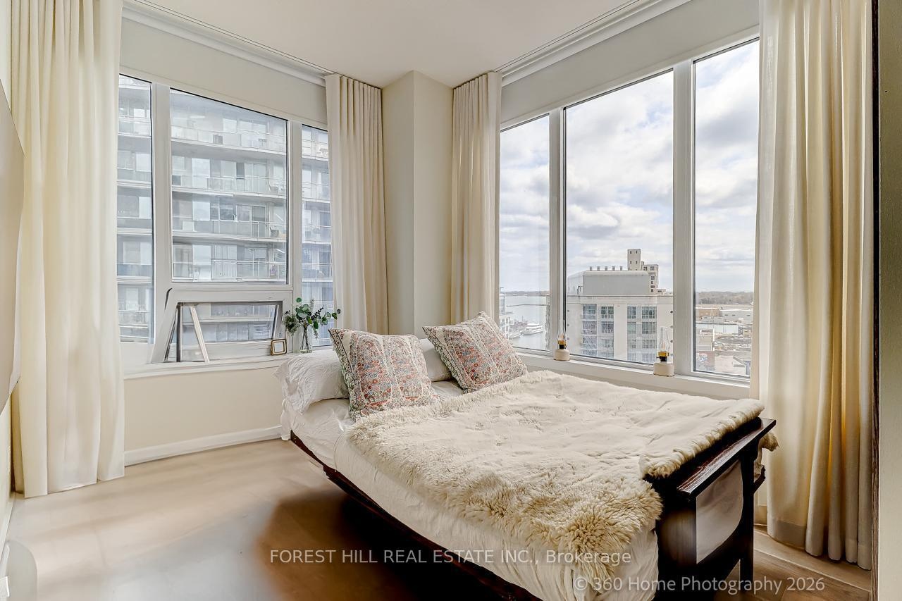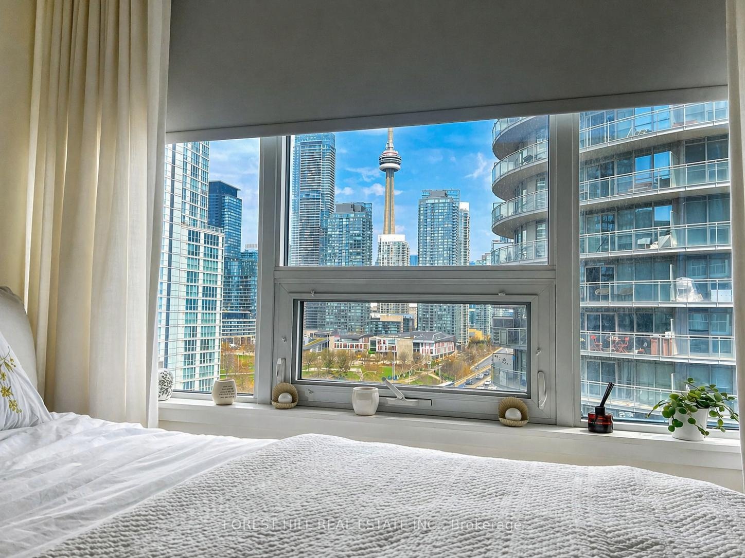 Welcome to elevated waterfront living at The Lakefront Condo -where modern luxury meets unbeatable downtown convenience in the heart of Toronto. This stunning south-east facing suite is filled with natural light and showcases unobstructed views of the iconic CN Tower and city skyline from both east-facing bedrooms, along with serene partial views of Lake Ontario. Meticulously upgraded throughout, the suite features engineered hardwood flooring, a sleek open-concept layout, and a designer kitchen with quartz countertops, marble backsplash, custom cabinetry with built-in organizers, and integrated stainless-steel appliances. The spa-inspired bathroom offers marble tile finishes, a modern woodgrain vanity with soft-close hardware, Kohler sink, and Grohe fixtures, delivering a refined, hotel-like experience. Additional upgrades include a custom stone feature wall, Hunter Douglas blackout roller shades, custom drapery, and in-suite stacked front-load laundry. Soaring 9-foot ceilings (excluding bathroom) enhance volume and sophistication. Includes 1 parking space and 1 locker. Residents enjoy a full suite of luxury amenities: fitness centre, rooftop terrace with panoramic views, elegant lounge, party and meeting rooms, guest suites, karaoke room, children's playroom, and pet spa-offering a complete lifestyle experience, not just a home. Perfectly located steps to TTC access, waterfront trails, parks, dining, and downtown core amenities, this turnkey residence is ideal for end-users and investors seeking strong value in a premier waterfront community.