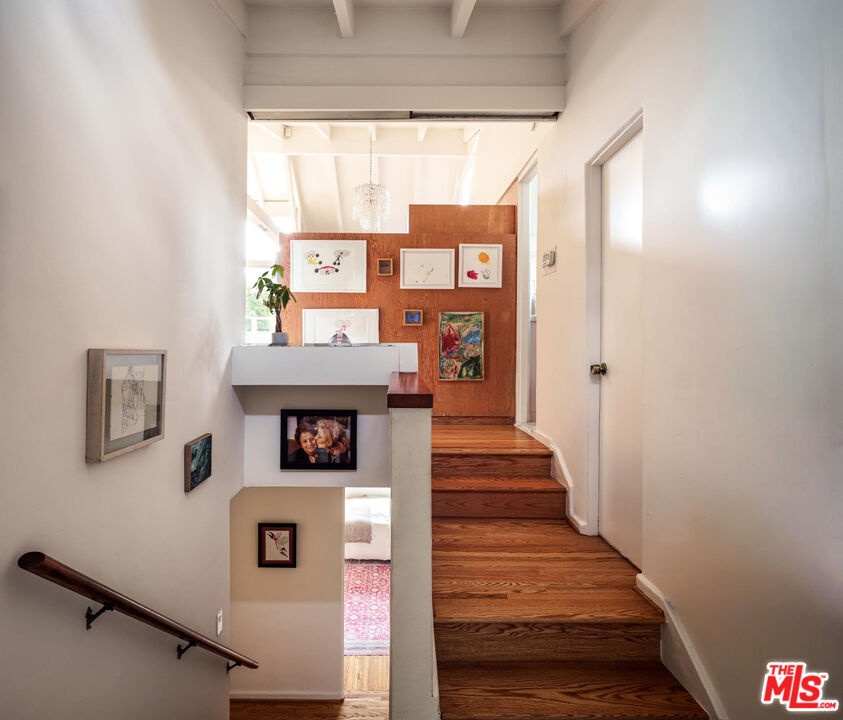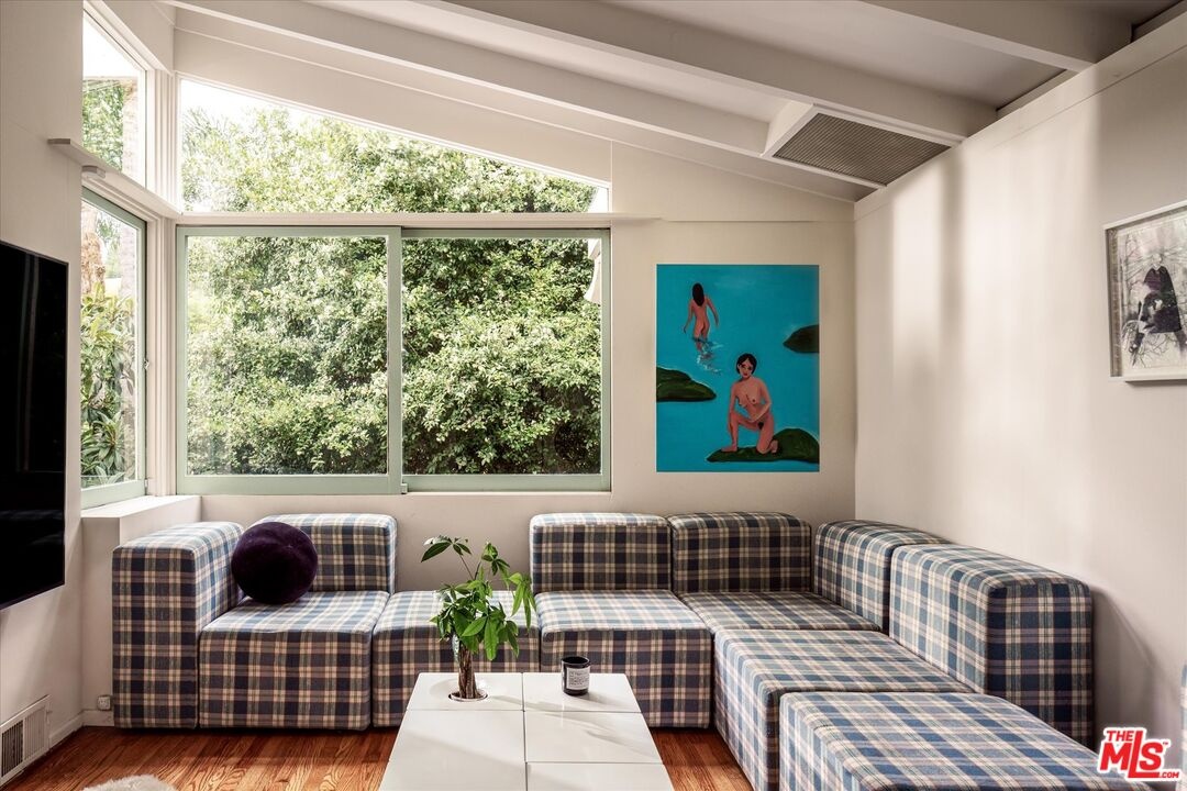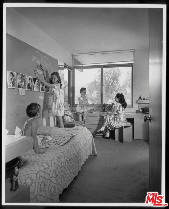 Designed in 1941 by modernist master R.M. Schindler, the Druckman Residence is a rare example of his late-period work in the Hollywood Hills. Conceived for Dr. Jacob S. Druckman and his wife, artist Margaret Druckman, the home features Schindler's distinctly asymmetrical gabled roof--concealing the house from the street while maximizing canyon views and light through dramatic clerestory windows. The residence balances openness with intimacy through Schindler's clever, split-level floor plan that separates the expansive public rooms from the private bedroom wing, creating both intimacy and privacy. The main living room is anchored by a dual indoor-outdoor fireplace, extending the interior seamlessly onto the front patio and reinforcing the home's early commitment to indoor-outdoor living. The adjacent kitchen preserves Schindler's original built-in breakfast nook, paired with updated appliances and surfaces in the spirit of the original design. A den beside the living area offers a quieter retreat with treetop views and sculptural ceiling lines. Down the split-level corridor, four bedrooms maintain a more intimate scale, adding to the home's overall efficiency. The value focus of the mid century movement is more relevant and important today with increased cost of living and ever increasing utility costs. Each is positioned to maximize natural light and connection to the outdoors. The primary suite includes canyon views, generous closet, and a recently updated en-suite bath, while the additional guest rooms also feature original built-ins and backyard access. Outside, newly terraced landscaping leads to a private oval pool--attributed to Richard Neutra. 2764 Outpost Drive is a rare architectural offering, combining architectural significance with everyday livability, one with a deep connection to light and landscape.