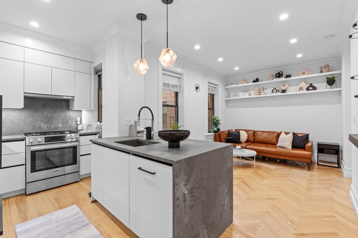 The open-concept kitchen is thoughtfully designed for both everyday living and entertaining, offering generous counter space and a center island with an integrated sink. Custom cabinetry conceals high-end appliances, creating a sleek, modern aesthetic.