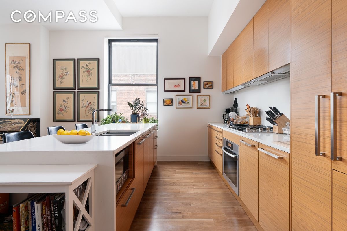 Enter onto an expansive open living space complete with a gas fireplace and Southern and Western exposures. The 11 foot ceilings allow for a lofty and airy feel. Opposite the living space is a chef's kitchen featuring Alta Cucina hand crafted rosewood cabinets and top-of-the-line appliances including a Miele stove top and built-in convection oven, Subzero refrigerator/freezer, and Miele dishwasher.