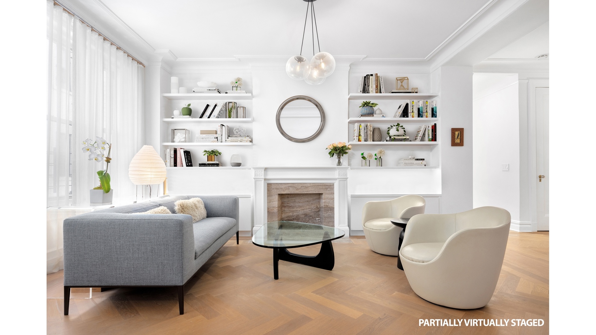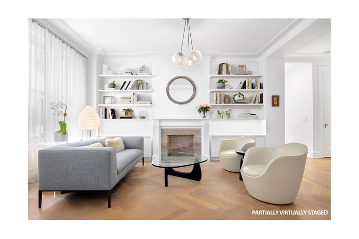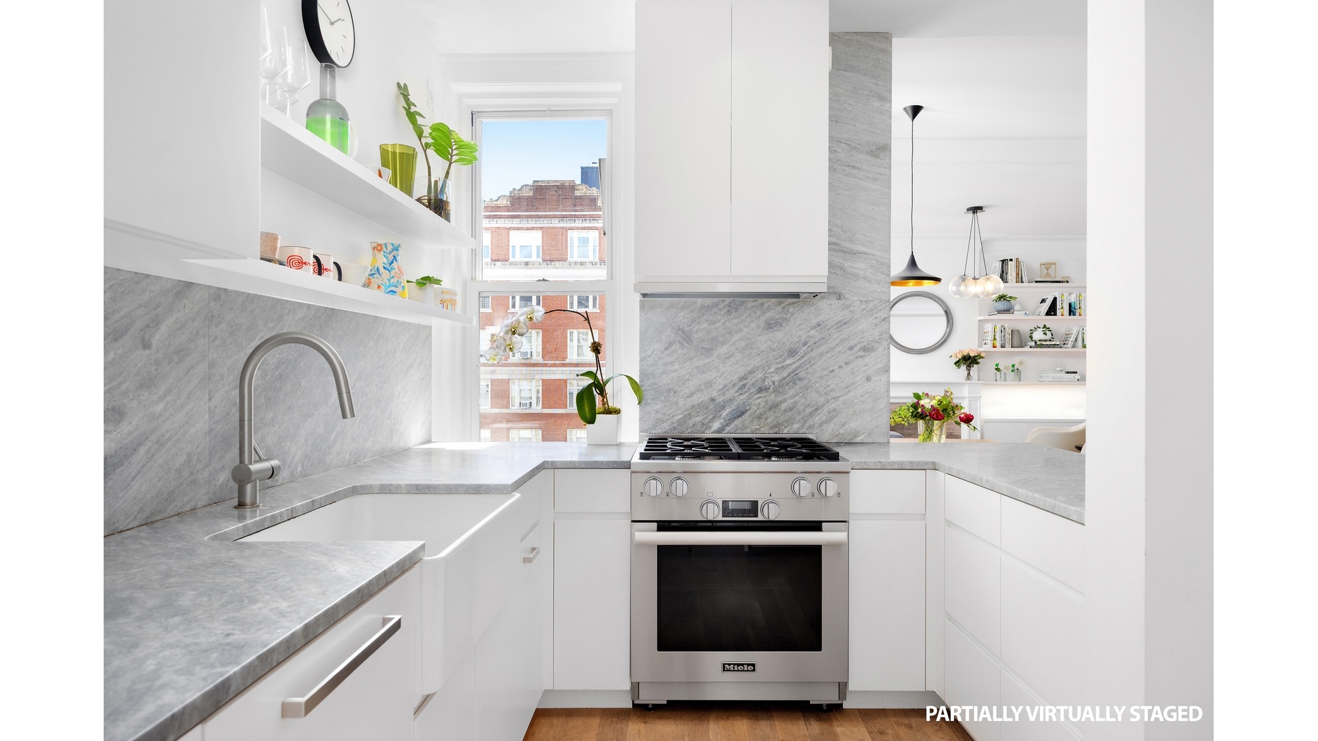 Expertly redesigned, you will now enjoy a dining area, TV room, and a sleek windowed kitchen with a breakfast bar, stone countertops, and top Miele appliances, including a stove, dishwasher, and fridge.