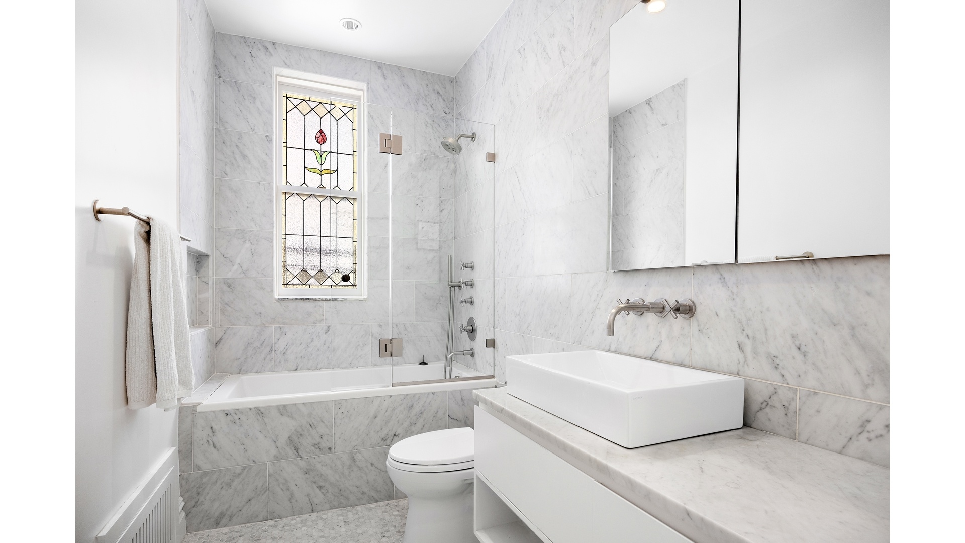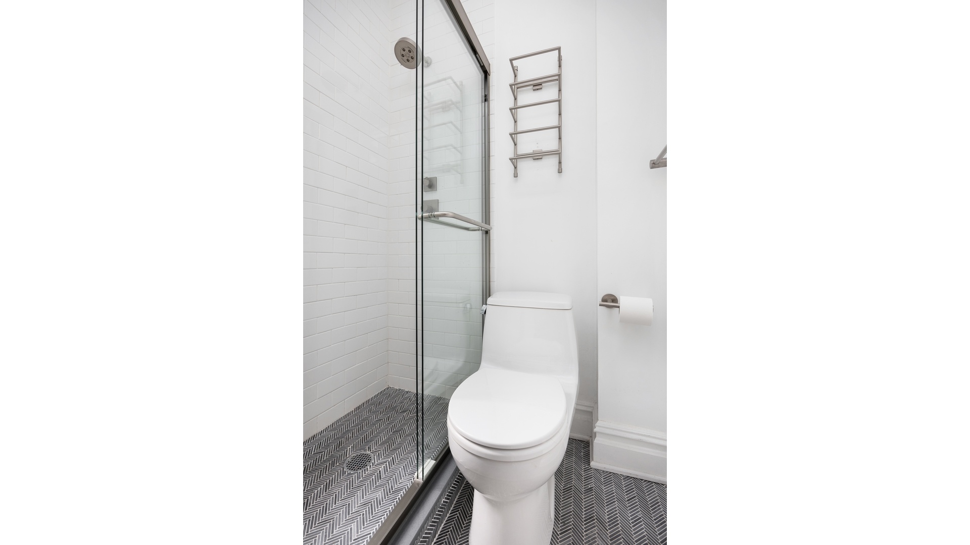 Down the hall are the larger two bedrooms, including the primary with its en-suite marble bathroom and glass-enclosed stall shower. The former staff room now offers the perfect smaller third bedroom (or office) with its own full bathroom.