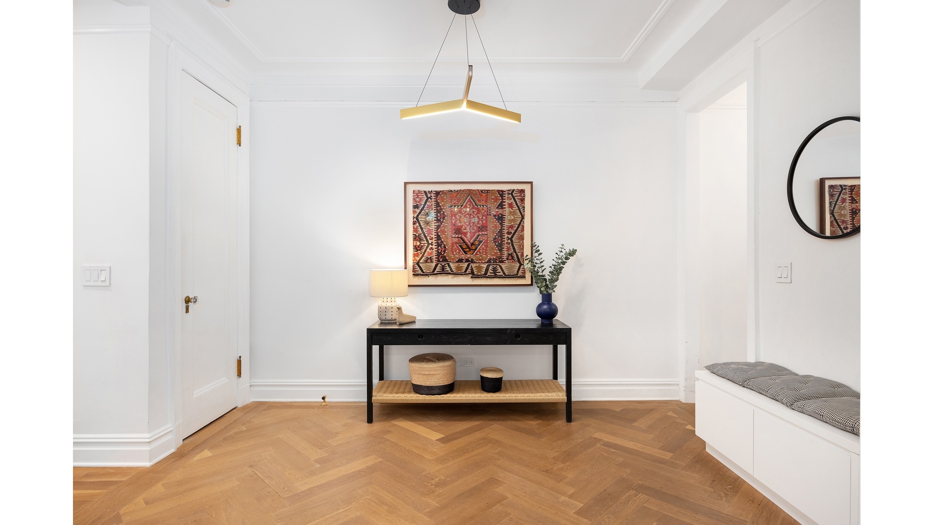 The elegant entry foyer leads into the spacious living room with its custom-built-ins, decorative fireplace, and a comfy bench with storage.