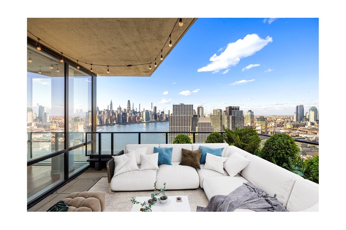 Wrapped in floor-to-ceiling glass, the great room is flooded with natural light and framed by sweeping northeastern vistas of Manhattan. Two separate access points lead to the home's crown jewel, a spectacular 275-square-foot private terrace. Generously proportioned and beautifully versatile, this outdoor sanctuary offers ample space for al fresco dining, lounging, and lush plantings, creating a rare extension of living that feels both elevated and serene. It is, in every sense, an entertainer's dream.