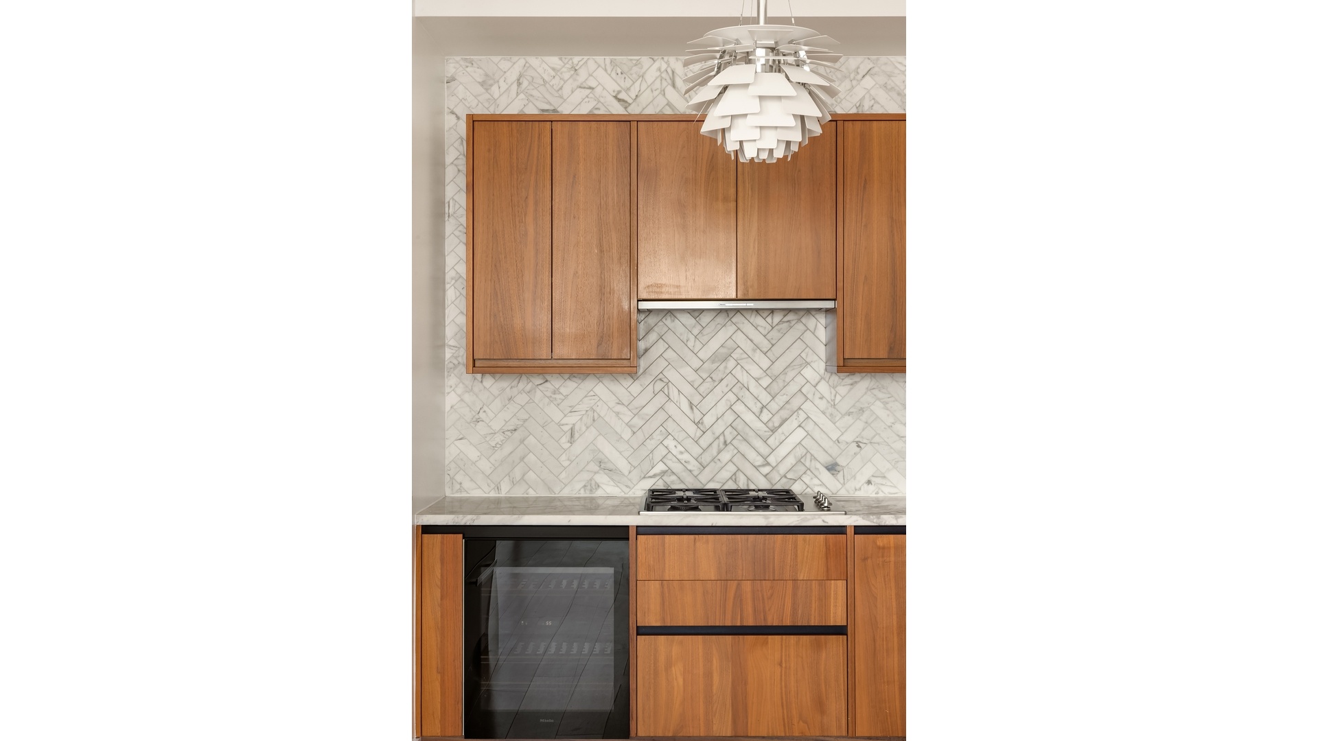 The gallery opens into a breathtaking open-concept great room, where the kitchen, dining, and living spaces merge effortlessly. Designed with both entertaining and everyday luxury in mind, the kitchen is a true centerpiece. This chef's paradise features a sculptural honed Statuario marble countertop and backsplash, custom cabinetry, a wine refrigerator, and a fully integrated Miele appliance suite, including a gas cooktop and double wall ovens. Wide-plank walnut flooring runs underfoot, anchoring the space in warmth and sophistication.