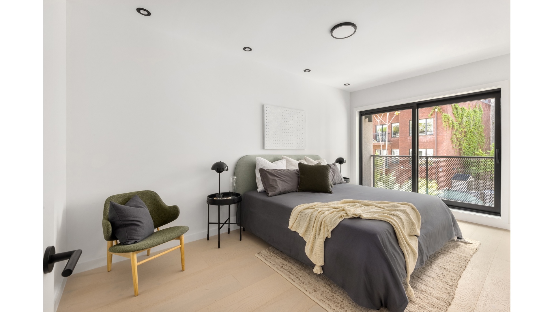 Set in the rear of the home, the bedroom wing feels quiet and tucked away. The primary suite is calm and inviting, complete with a private balcony and an en suite bath featuring matte black Huntington Brass hardware and custom built in storage.