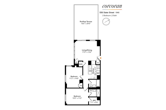 556 State Street, Apt 8AS is a bright and beautifully laid out two-bedroom, two-bathroom home in the heart of Boerum Hill, complete with a spectacular private roof deck and the ease of full-service condominium living.