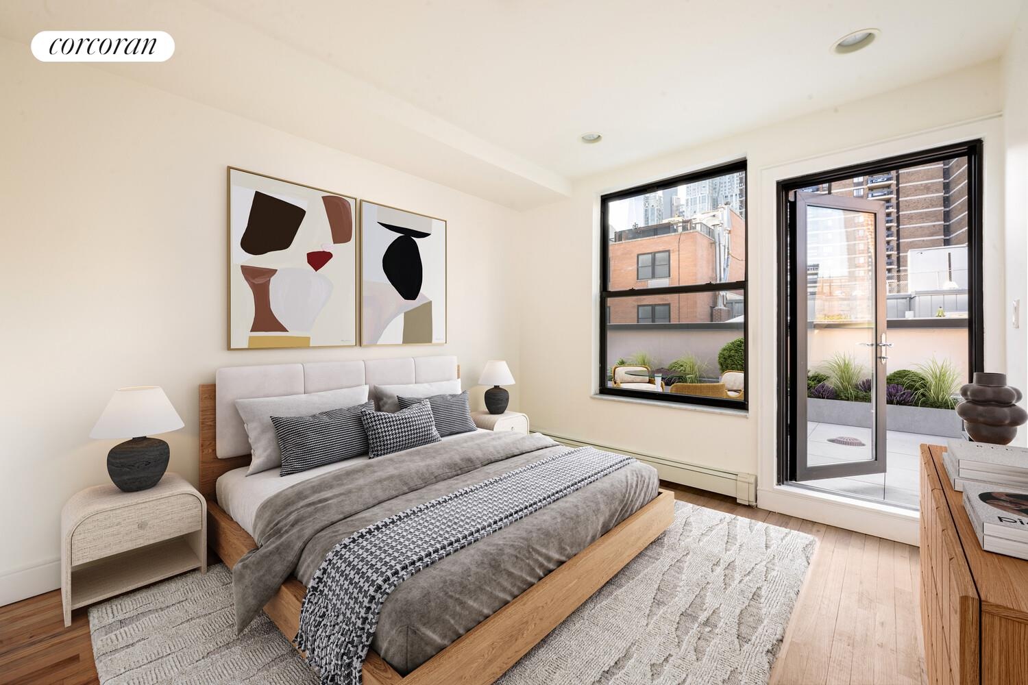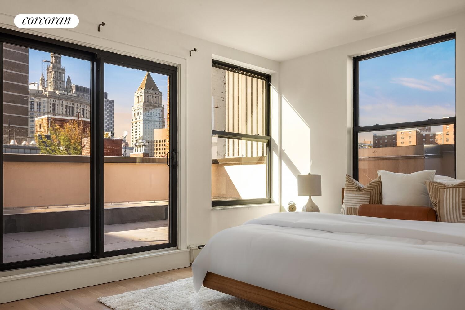 Upstairs, both bedrooms serve as private retreats, each with its own full bath and direct access to a wraparound terrace. Open exposures showcase iconic downtown views, including the One World Trade Center and beyond.