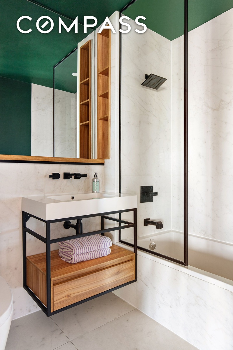 Right now, it’s a generous one-bedroom, but the option to easily convert is there if you need it. The primary suite features California Closets, a beautiful en-suite bath with Italian porcelain tile, a floating vanity, matte-black fixtures, and a walk-in shower. And yes, there’s an in-unit washer/dryer.