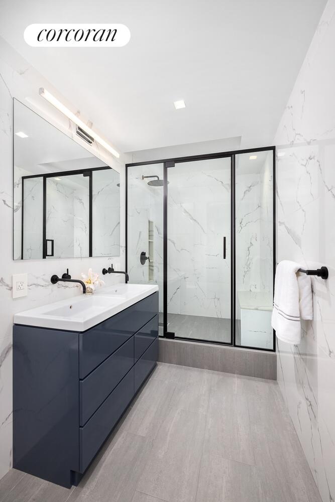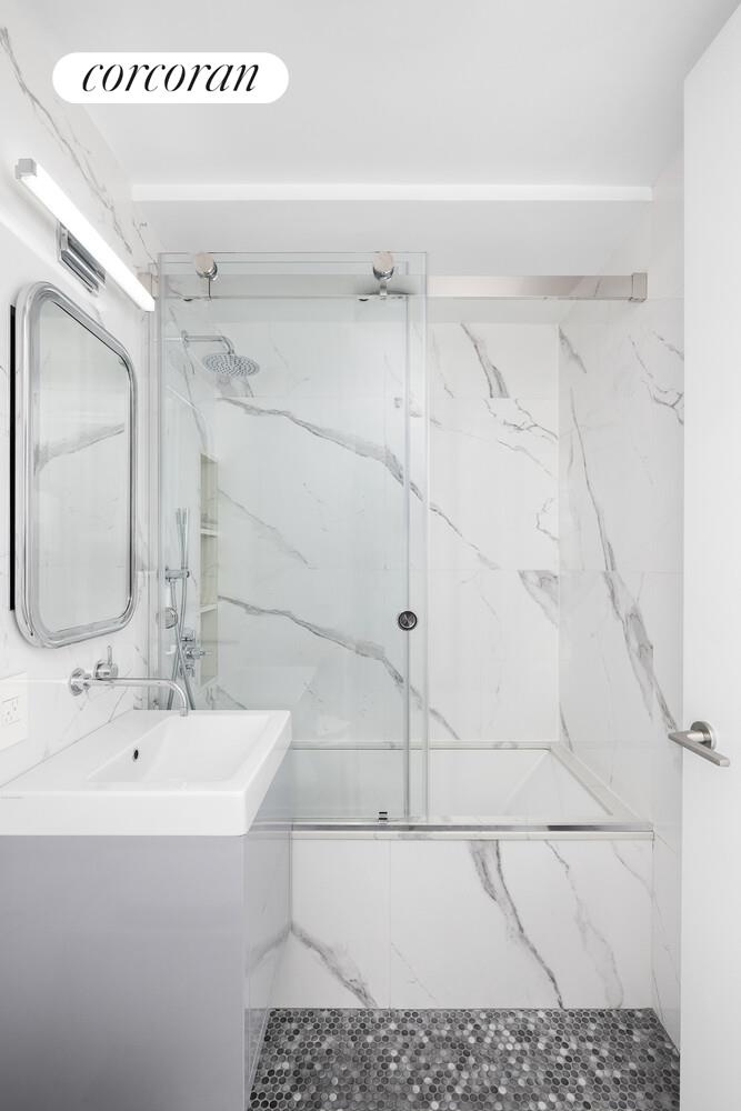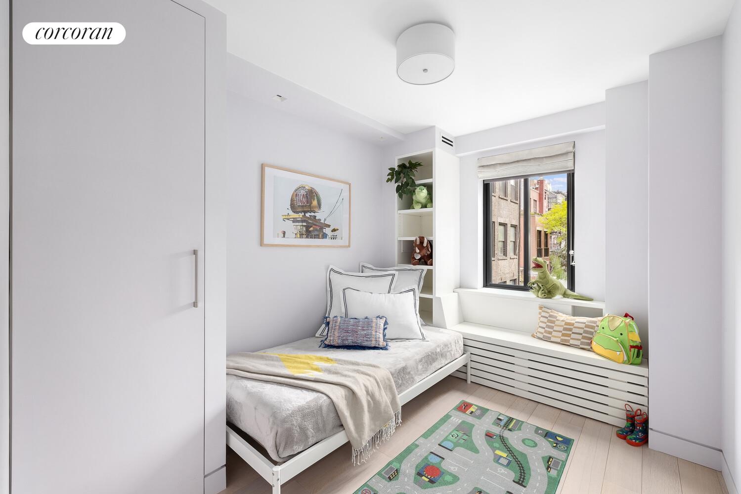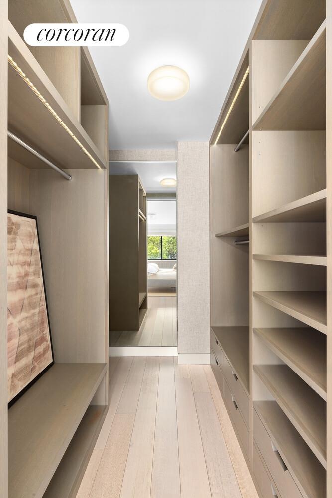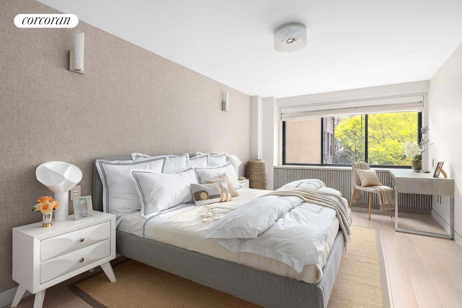 The second bedroom-or ideal home office-is perfectly sized, offering a full-length closet and an under-window built-in that works beautifully as a window seat or additional storage.The primary suite encompasses the entire northern end of the apartment and is truly enormous. It features a wall of windows with under-window storage that seamlessly leads into a sun-filled work-from-home setup. There are three closets, including an oversized, beautifully built-out pass-through that leads directly to the primary bathroom. The primary bathroom is an oasis with dual sinks and an oversized shower complete with a built-in seat for ultimate rest and relaxation.