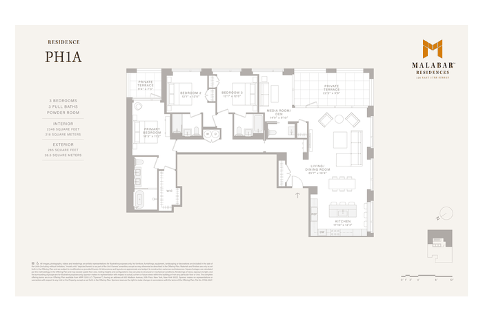 Penthouse 1A is one of four trophy residences in the Malabar Penthouse Collection. This three-bedroom, three-and-a-half-bath residence comprises approximately 2,346-square-feet and is distinguished by extraordinary scale, 12-foot 6-inch ceilings highlighted by cove lighting, and an inviting fireplace. Dramatic cityscape views to the south of the Chrysler Building and East River to the east capture light from morning through evening. Two private terraces totaling approximately 285 square feet extend the living experience beyond the walls of the home, offering multiple vantage points for both quiet reflection and open-air entertaining.