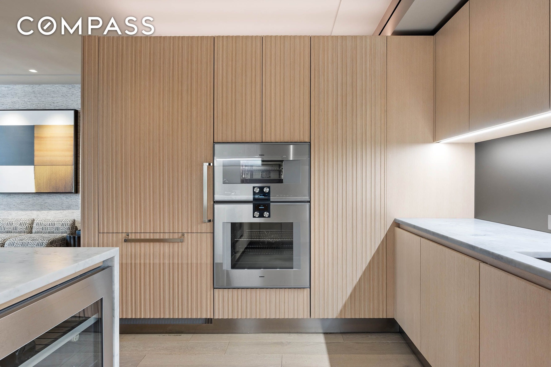 Residence 2A is a prime example of the ultra-luxe elegance, with expansive 1,778 sq ft interiors bathed in natural light. A private keyed elevator opens into loft-like living space featuring airy 10’ ceilings, custom millwork, gorgeous wide-plank European oak wood floors, custom hardware and other refinements throughout. The open-concept great room invites comfort and entertaining with generous living/dining areas, a wall of floor-to-ceiling windows and glass doors to a Juliet balcony. The stunning kitchen, custom designed by BKSK for Arclinea, is a real showstopper with Italian white oak cabinetry, stainless steel accents, Calacatta marble countertops & breakfast bar with waterfall edge, a stainless steel sink basin by Blanco with Dornbracht faucet, and custom back-painted statin-etched tempered glass backslash. A suite of premium Gaggenau appliances awaits for the chef including a 5-burner gas cooktop, double wall oven with steam oven combo, panelized refrigerator/freezer, under-cabinet wine fridge & built-in dishwasher.