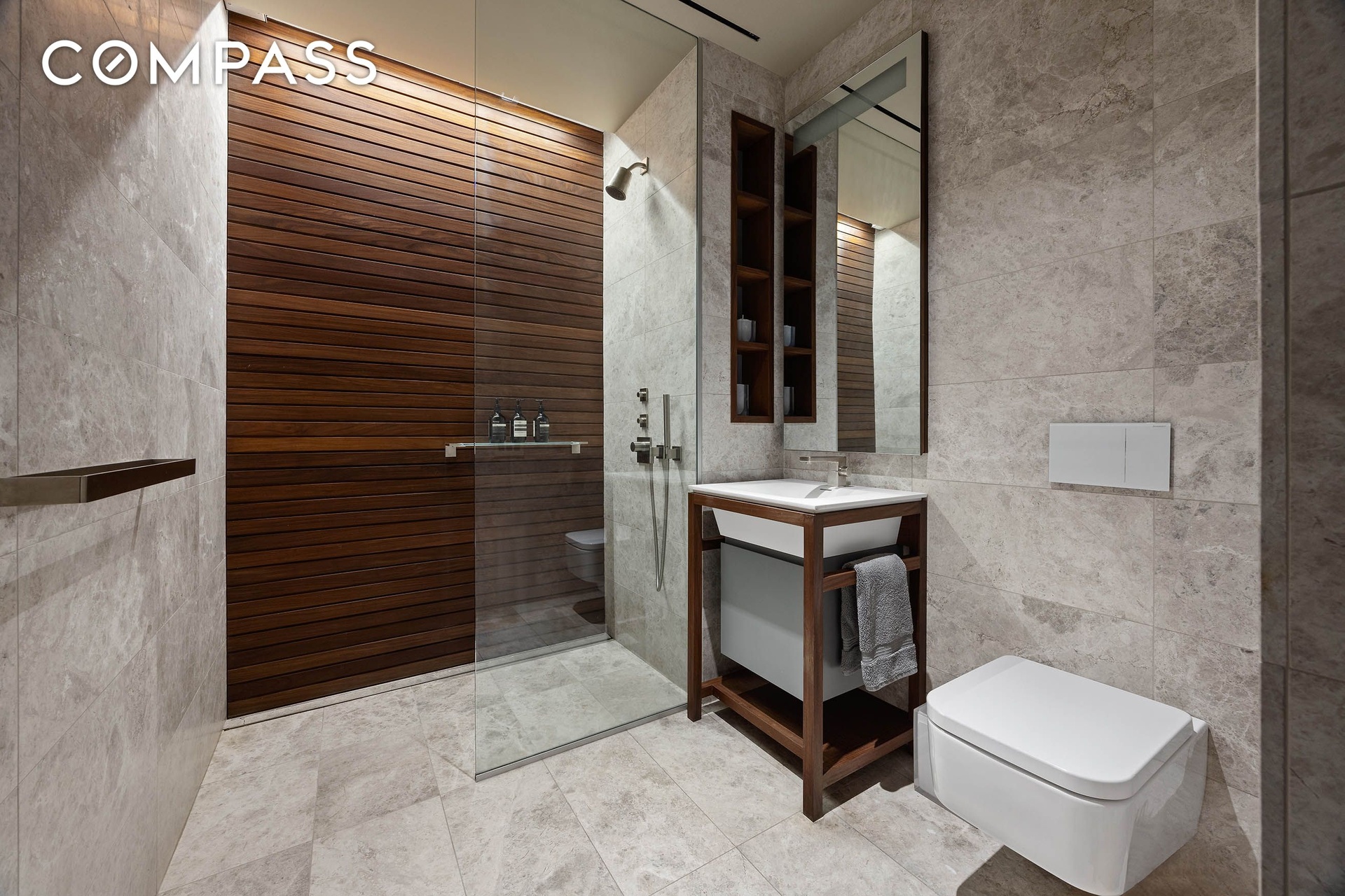 Refresh and renew in your beautiful primary suite with oversized windows, a huge walk-in + additional closets, and a spa-like bath. Quartzite slab floors, walls & countertop, a custom double vanity with teak accents & integrated lighting, custom glass steam rain shower, soaking tub clad in quartzite & teak, private water closet with Laufen ceramic wall-hung toilet & Cyprum Dornbracht fixtures elevate the experience. The split-bedroom layout affords privacy, with the 2nd bedroom & bath as richly appointed. Additional highlights are a stacked & vented washer-dryer, and convenient service entrance.