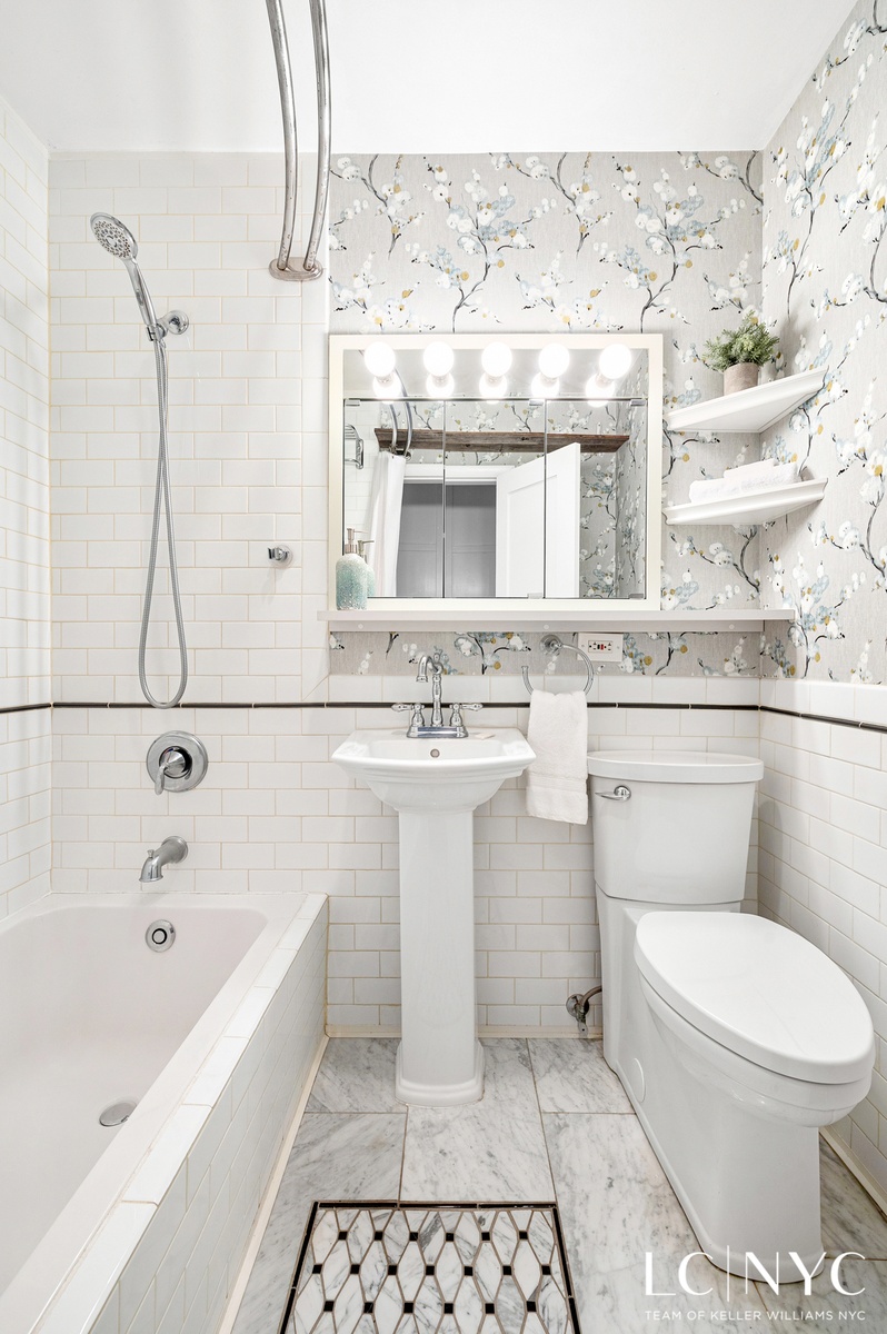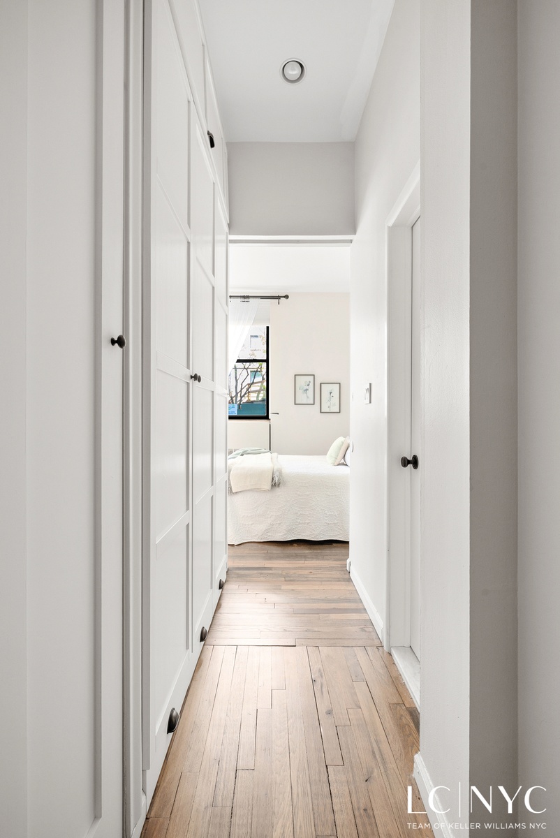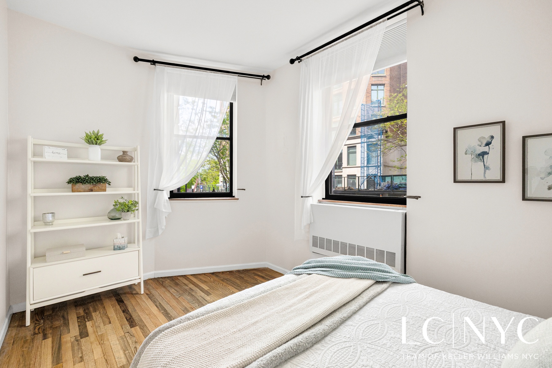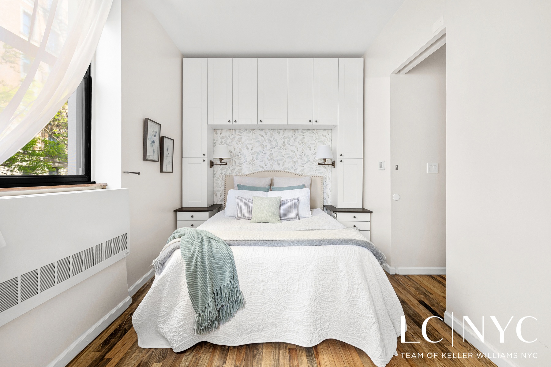 The generously sized primary corner bedroom boasts double exposure, oversized windows, and thoughtfully designed custom built-ins offering both comfort and ample storage. Additional storage abounds with entry closets and a full wall of closets leading to the bedroom. The beautifully renovated bathroom showcases marble finishes and a soaking tub, creating a refined, spa-like retreat.