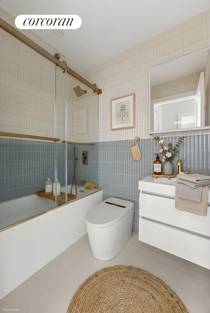 The bathroom is finished with a refined mix of textures, including vertically stacked tile, a deep soaking tub with glass enclosure, and warm brass fixtures that add a subtle, elevated touch.
