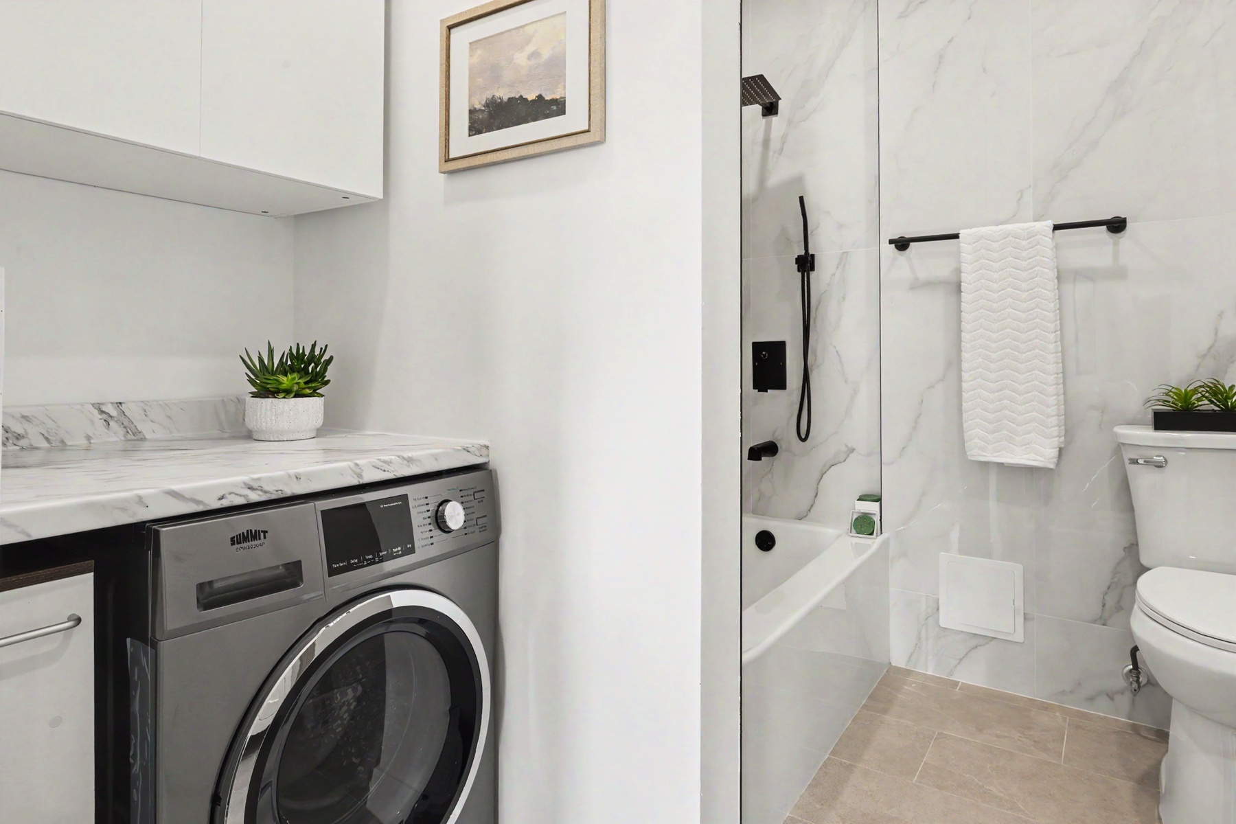 The spa-like bathroom has been beautifully reimagined, featuring a deep soaking tub, double-sink vanity with ample drawer storage, and sophisticated matte black finishes set against elegant tilework. A discreet, under-counter washer/dryer is seamlessly incorporated, along with a custom linen cabinet and functional folding space.
