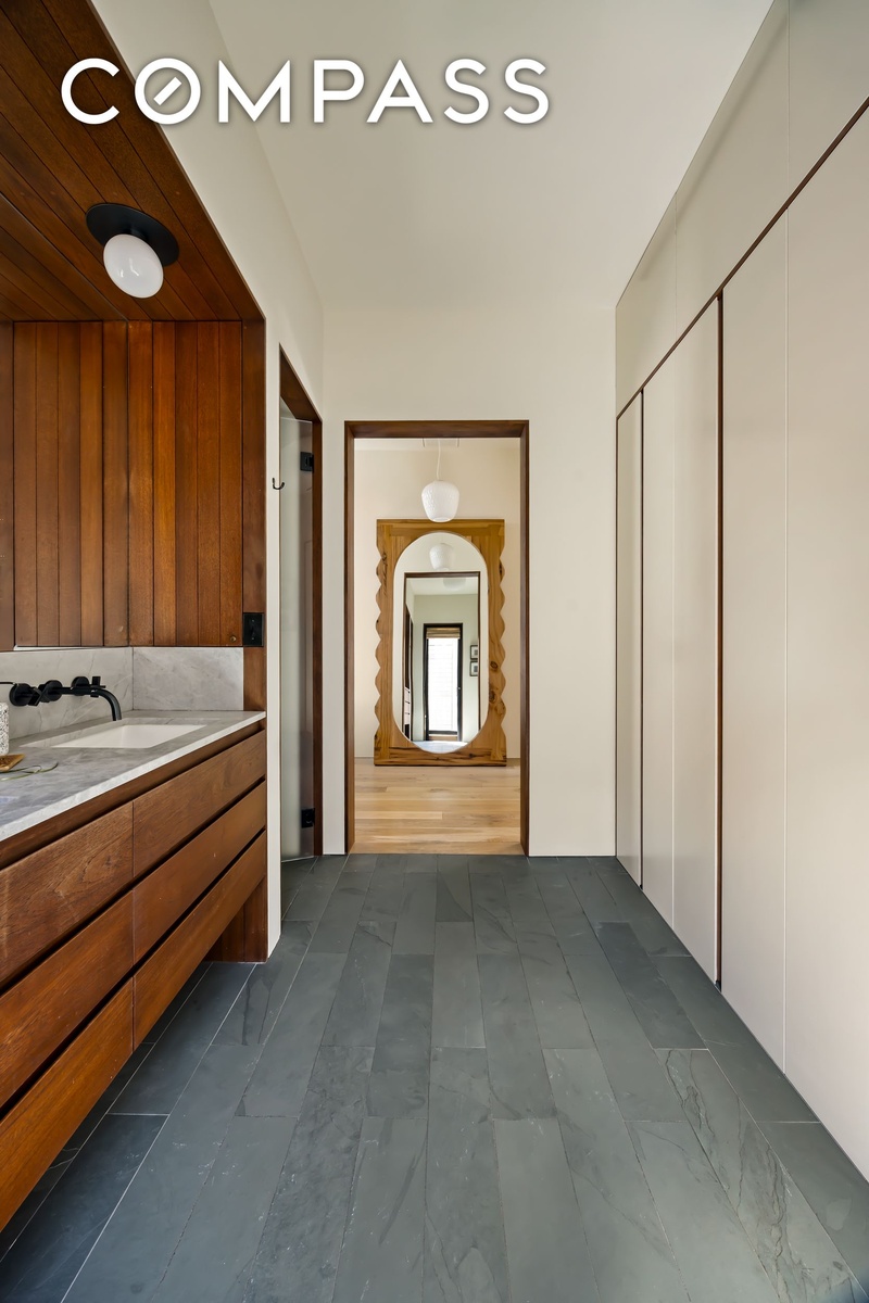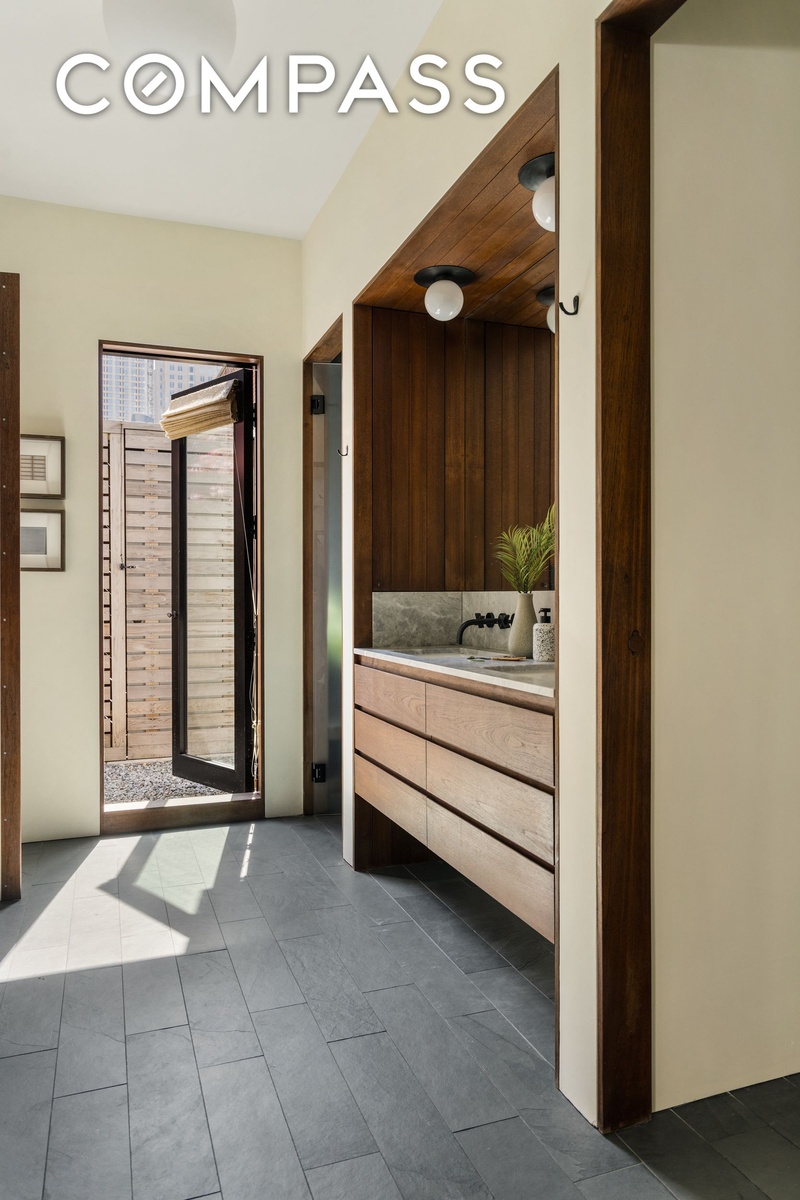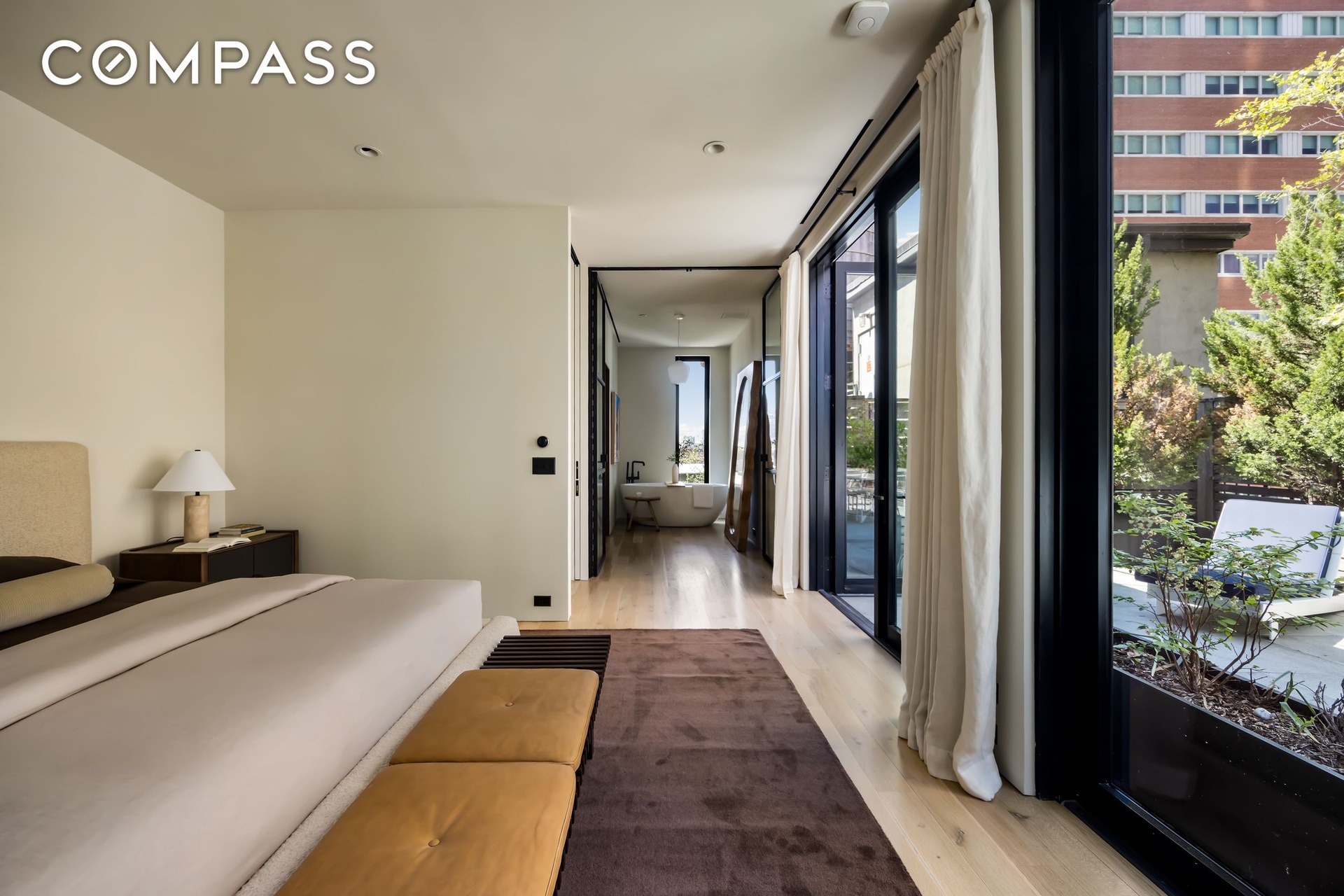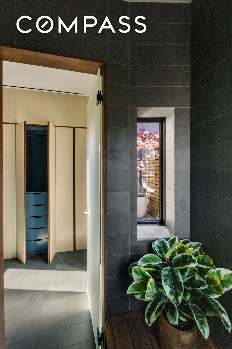 The upper floor is devoted to the primary suite, where floor-to-ceiling windows open onto a generous private terrace with city views. The primary bathroom is finished with a double vanity, a soaking tub, and a separate windowed shower.