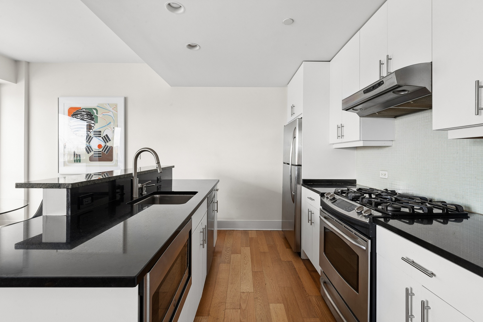 The spacious living and dining area is framed by oversized windows and filled with natural light, creating a bright and inviting setting for both everyday living and entertaining. The chef’s kitchen is thoughtfully designed with a large center island, stainless steel appliances, granite countertops, a breakfast bar, and ample cabinetry.