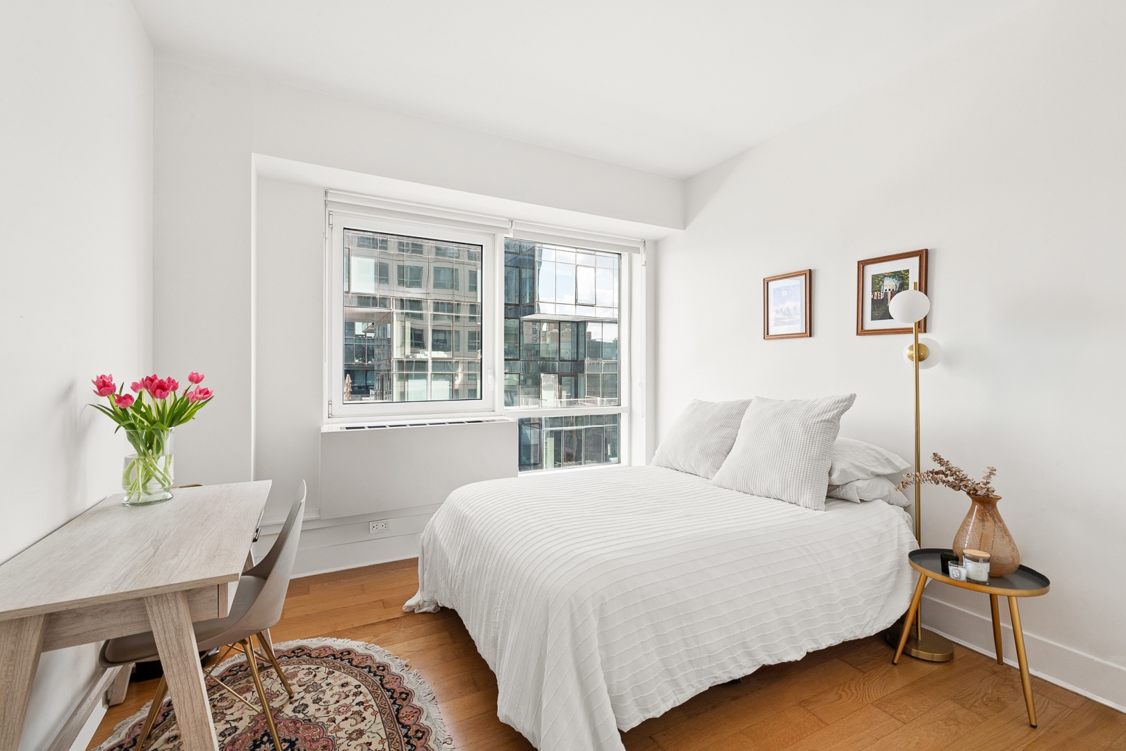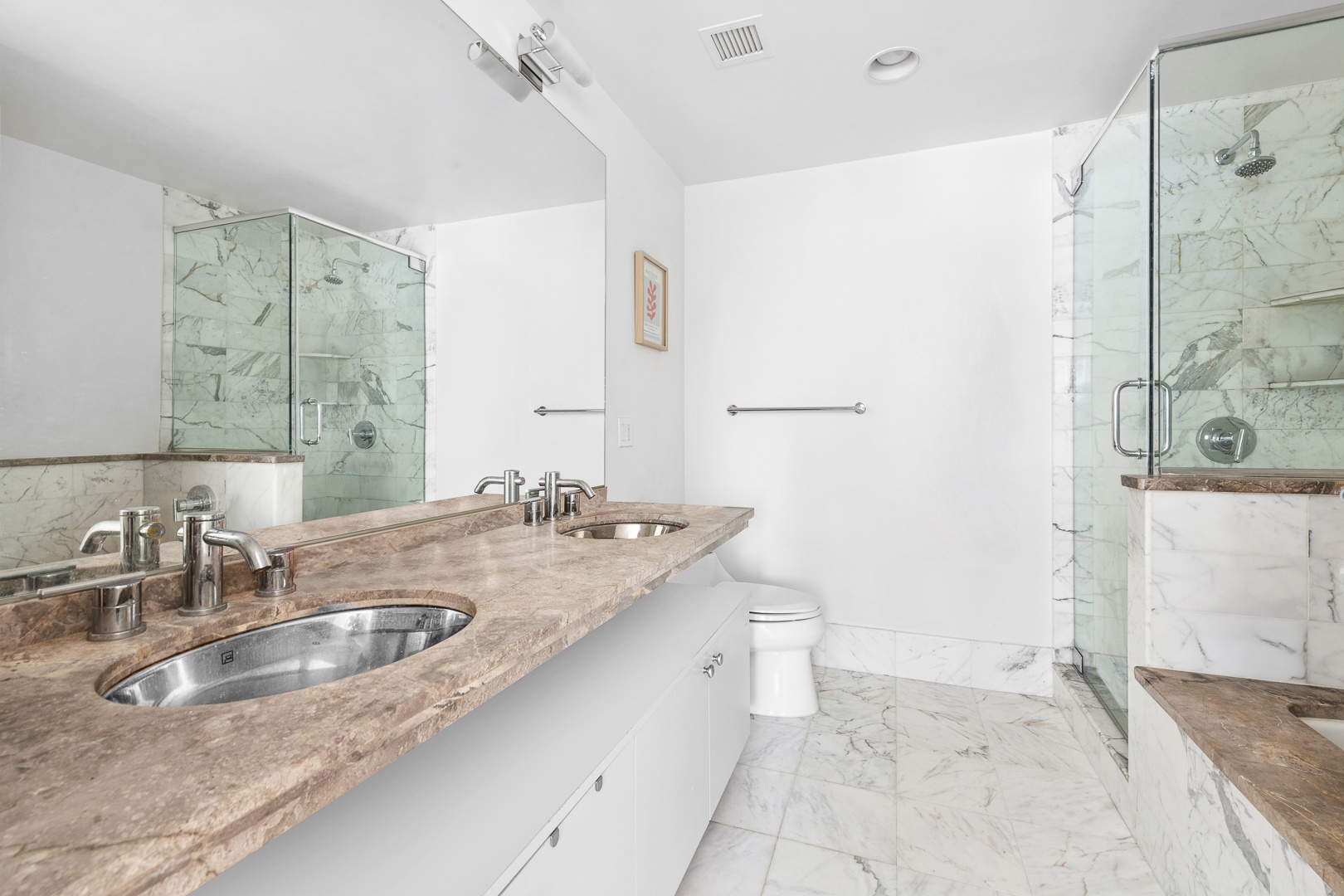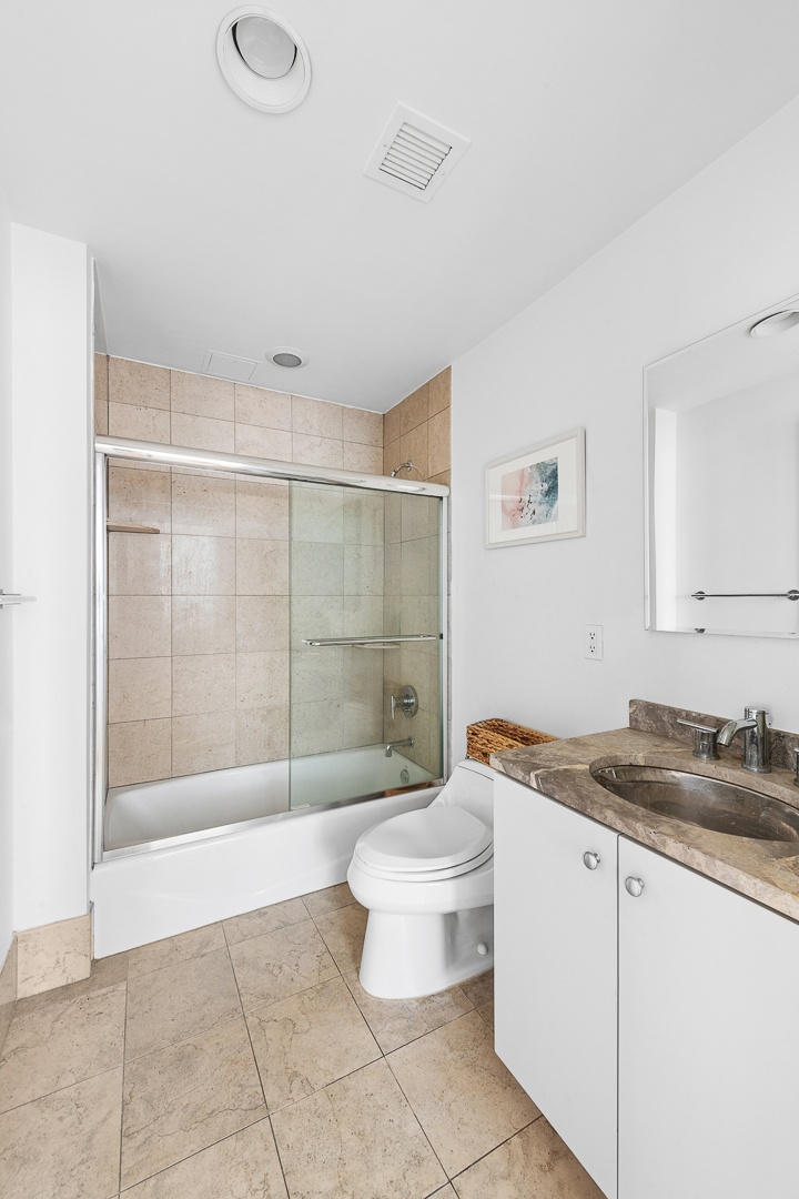 The oversized primary suite features a walk-in closet and a spa-like en-suite marble bathroom complete with double vanities, a deep soaking tub, and a separate glass-enclosed shower. The secondary bedroom is well proportioned and ideally positioned near the second full bathroom, making it perfect for guests, a home office, or additional bedroom use.
