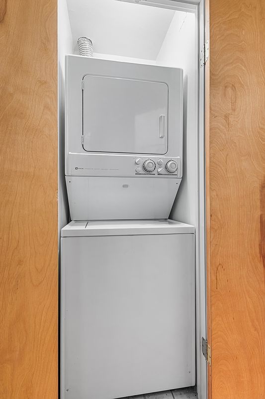 The oversized U-shaped kitchen is both practical and inviting, complete with generous counter space and a breakfast bar for casual dining. Storage is a true highlight, with an excellent amount of closet space throughout the home. The apartment also features a vented full-size stacked washer/dryer, a rare and valuable convenience. The windowed bathroom includes a stall shower and brings in natural light and ventilation.