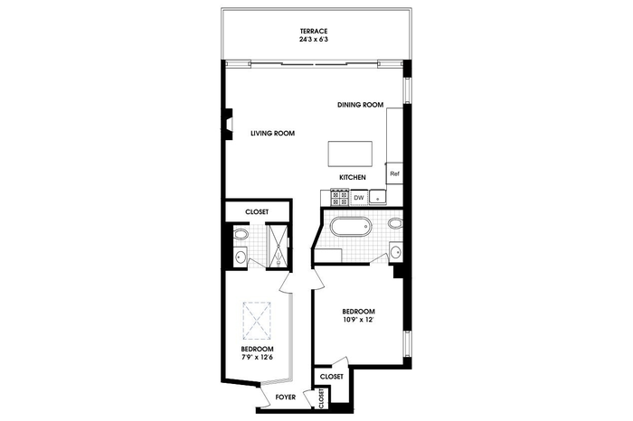 Glass doors open to a private 140 sq ft southeast-facing terrace with open views of the Roosevelt Island Tram and First Avenue-perfect for entertaining or relaxing.