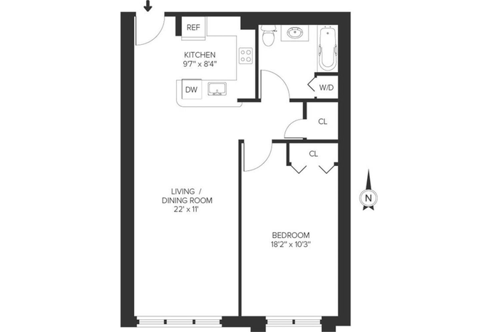 Both the living room and bedroom are equipped with wall-through air conditioners, providing efficient climate control without compromising natural light or views. The bathroom offers a relaxing soaking tub and the convenience of an in-unit washer and dryer.