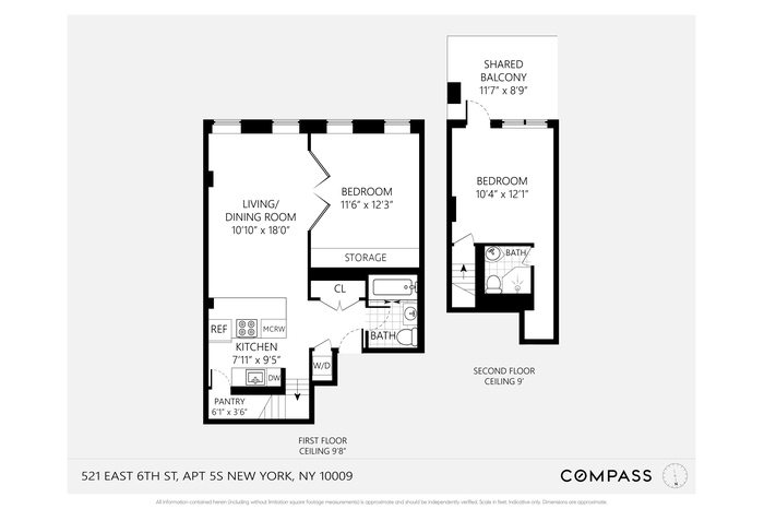 Situated five flights up, this thoughtfully configured home opens to a sun-filled main level with approximately 9.7-foot ceilings, exposed brick, and open southern views over classic East Village tenements. The renovated chef’s kitchen is equipped with a Whirlpool and Bosch appliance package, including a dishwasher, and is complemented by a dedicated pantry.