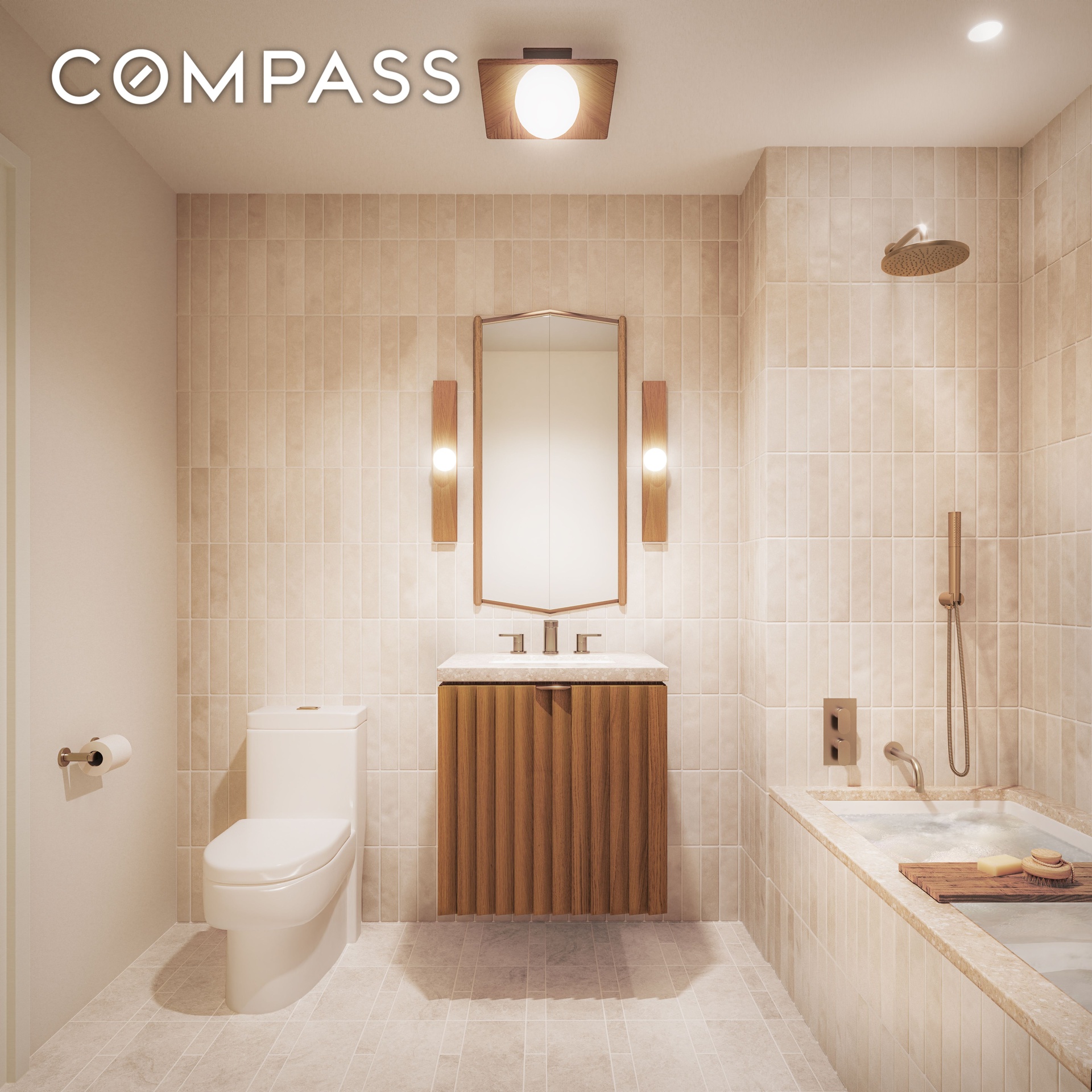 The bathrooms at Bergen are outfitted with soft tones and warm wood accents with materials that are crafted to last. The custom white oak vanity is topped with a honed Agglo terrazzo countertop, matte Tatami-Beige wall tiles and honed Agglo terrazzo floor tiles, with radiant heated floors and custom light fixtures by Workstead.