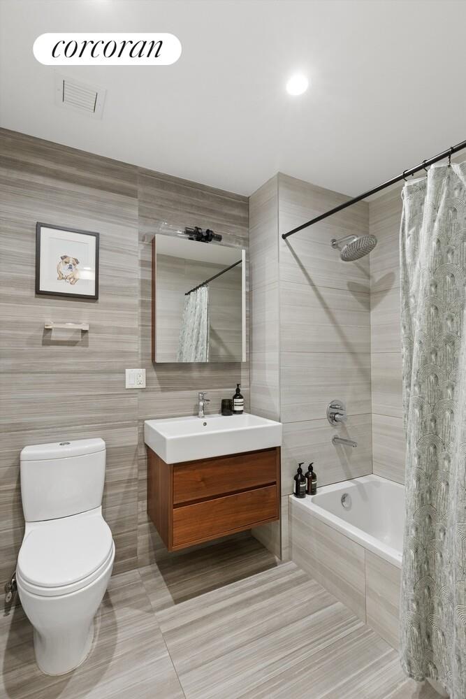 The bedroom accommodates a king-sized bed and includes oversized windows and a double-door closet. The bathroom is finished with Artwork tile and features radiant heated floors, a DuraVit soaking tub, and a KEUCO vanity and medicine cabinet. Additional features include a laundry closet with a stacked Whirlpool washer and dryer, a separate linen closet, and a deeded storage cage in the basement.