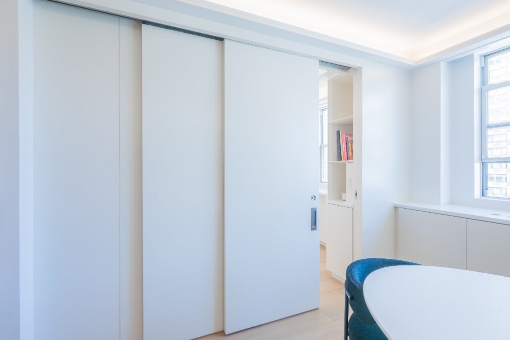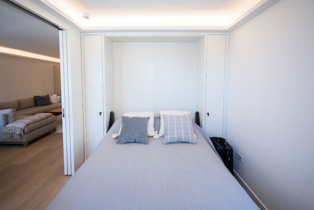 The flexible two-bedroom layout includes a secondary room outfitted with a built-in Murphy bed, seamlessly functioning as a guest suite, home office, or nursery as needed.
