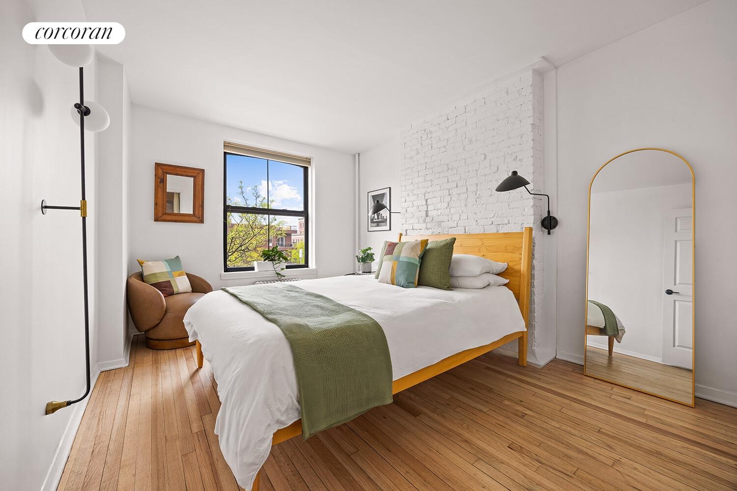 The inviting living room has exposed brick and offers flexibility for a dining area or a cozy home office setup. The kitchen and living room have charming views overlooking the shared courtyard below. The bathroom has been tastefully updated with modern fixtures and finishes, while the bedroom has a large closet and can easily accommodate a queen-sized bed with room for additional storage. Hardwood floors and high ceilings can be found throughout the home.
