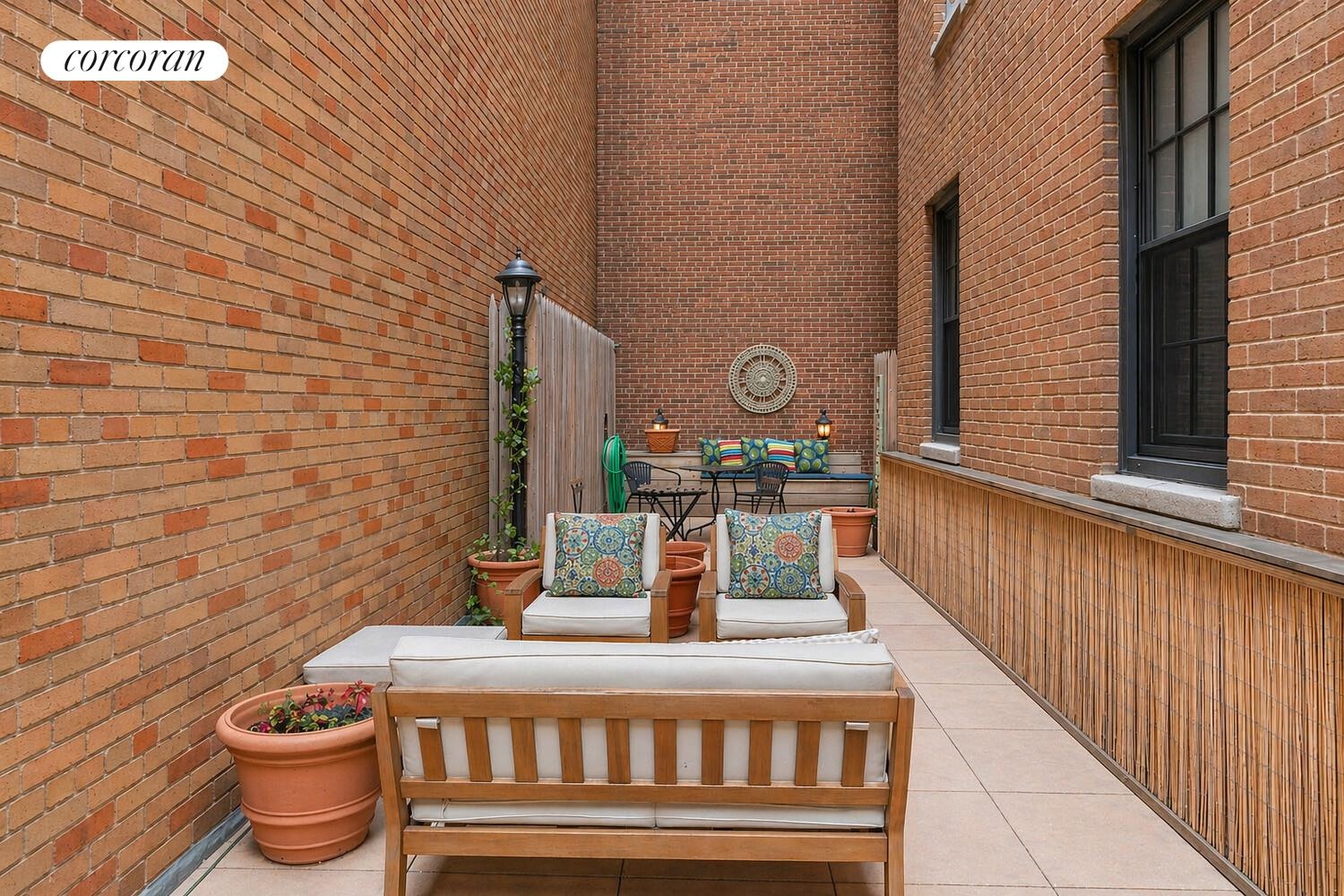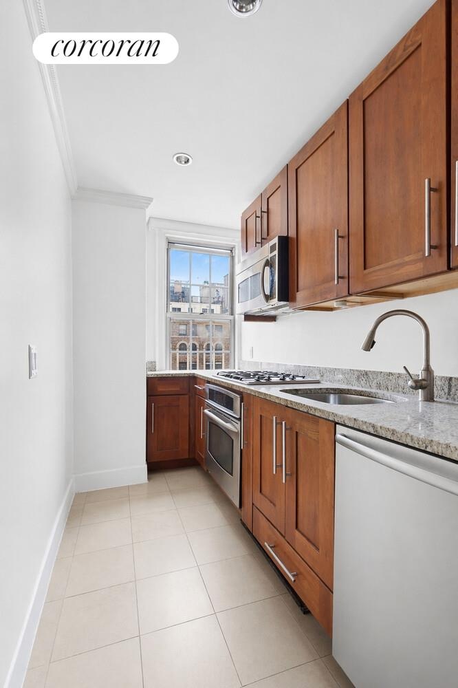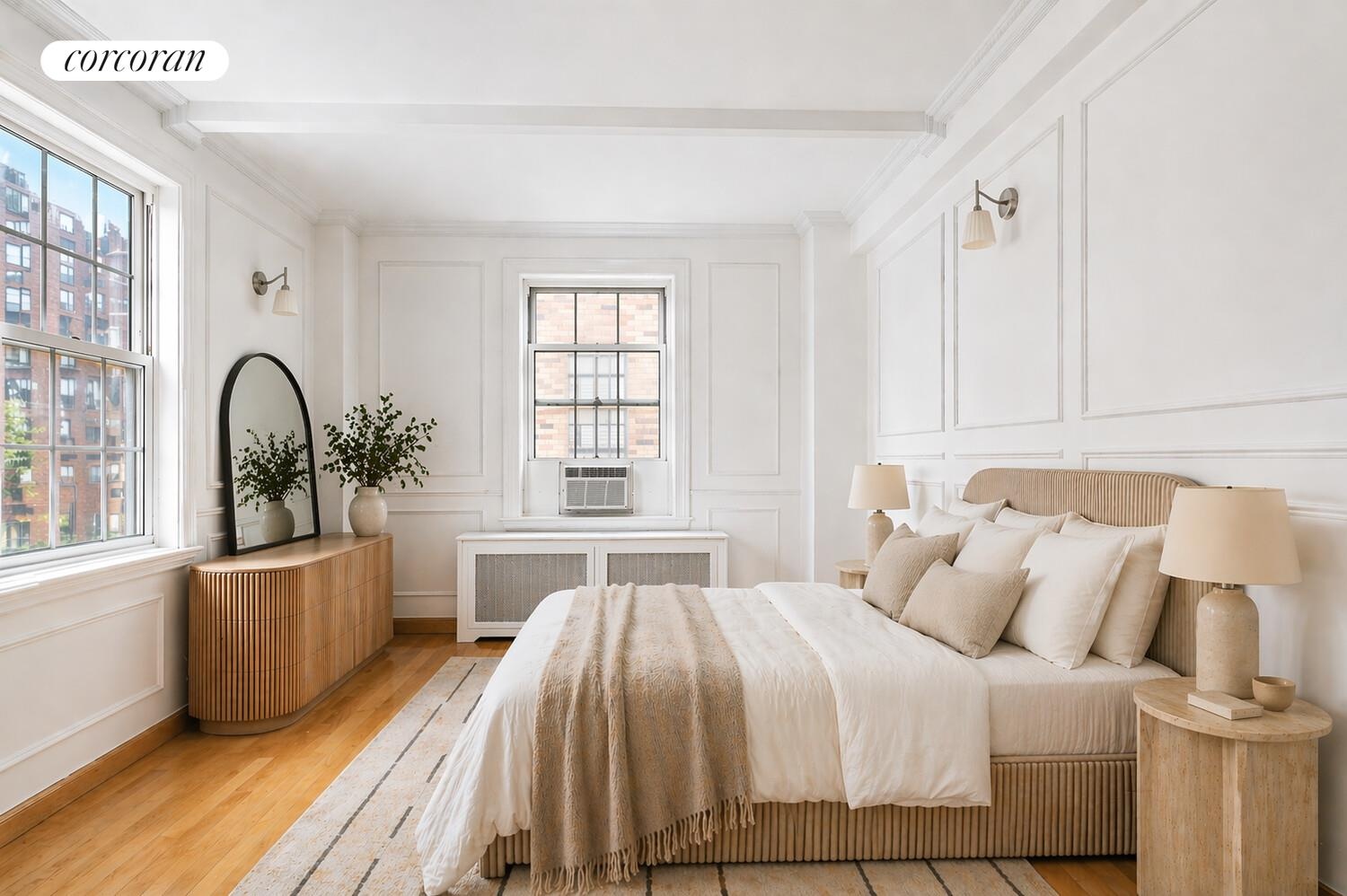 Upon entering, you are greeted by a gracious foyer leading to a windowed kitchen designed with both form and function in mind, featuring stainless steel appliances along with generous cabinet and counter space. The expansive living area is bright, open, and serene, anchored by three oversized windows that flood the space with natural Southern light. The beautifully restored hardwood floors, high beamed ceilings & spacious area are ideal for everyday living and entertaining. A built-in bookshelf only adds to the prewar charm & character, while abundant storage enhances everyday functionality. The corner bedroom enjoys both Southern & Eastern exposures, offering natural light throughout the day. This tranquil retreat features an en-suite bathroom and a spacious walk-in closet, combining comfort with convenience.