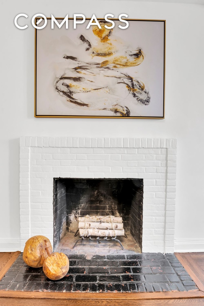 The north facing, massive living room is flooded with natural light and highlighted with a working, wood burning fireplace. Full of elegance and charm, the apartment boasts beamed, high ceilings, gorgeous oak floors throughout and an open, bright kitchen with a large window and dishwasher. There is ample storage, with two large closets in the foyer, and a huge, custom walk-in closet in the bedroom. A full wall of additional storage and built-in shelving frames the fireplace.