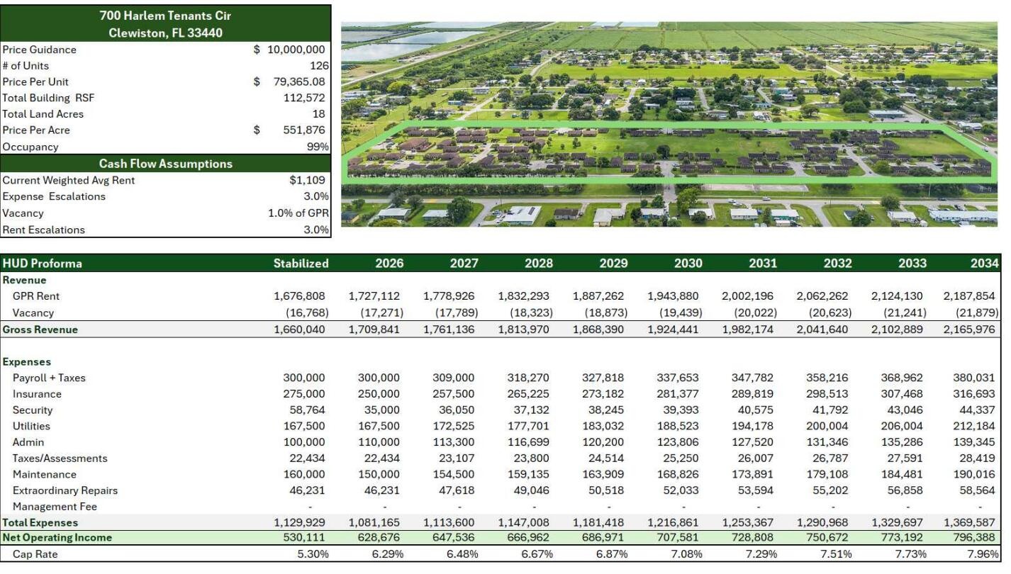 Harlem Garden Apartments is a 126 unit, fully HAP assisted property sitting on 18 acres in Clewiston with no property taxes.