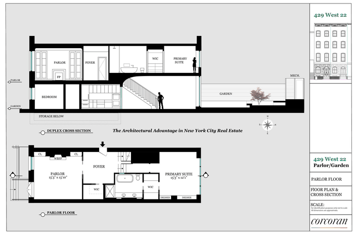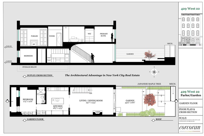 429 West 22nd Street #1B is a two-bedroom Chelsea townhouse duplex - architecturally reimagined at every level, with sculptural precision and an uncommon sense of openness. At approximately 2,162 square feet including a 560-square-foot private garden, the residence occupies the parlor and garden floors of a double-wide Anglo-Italianate townhouse built in 1855 by Morgan Pindar, one of three landmarked row houses on a quiet, tree-lined block. A comprehensive gut renovation to the studs - new electric, plumbing, windows, doors, and integrated audiovisual throughout - was conceived and executed by Drew Lang of Lang Architecture, holding historic detail and contemporary discipline in equal measure across both floors.
