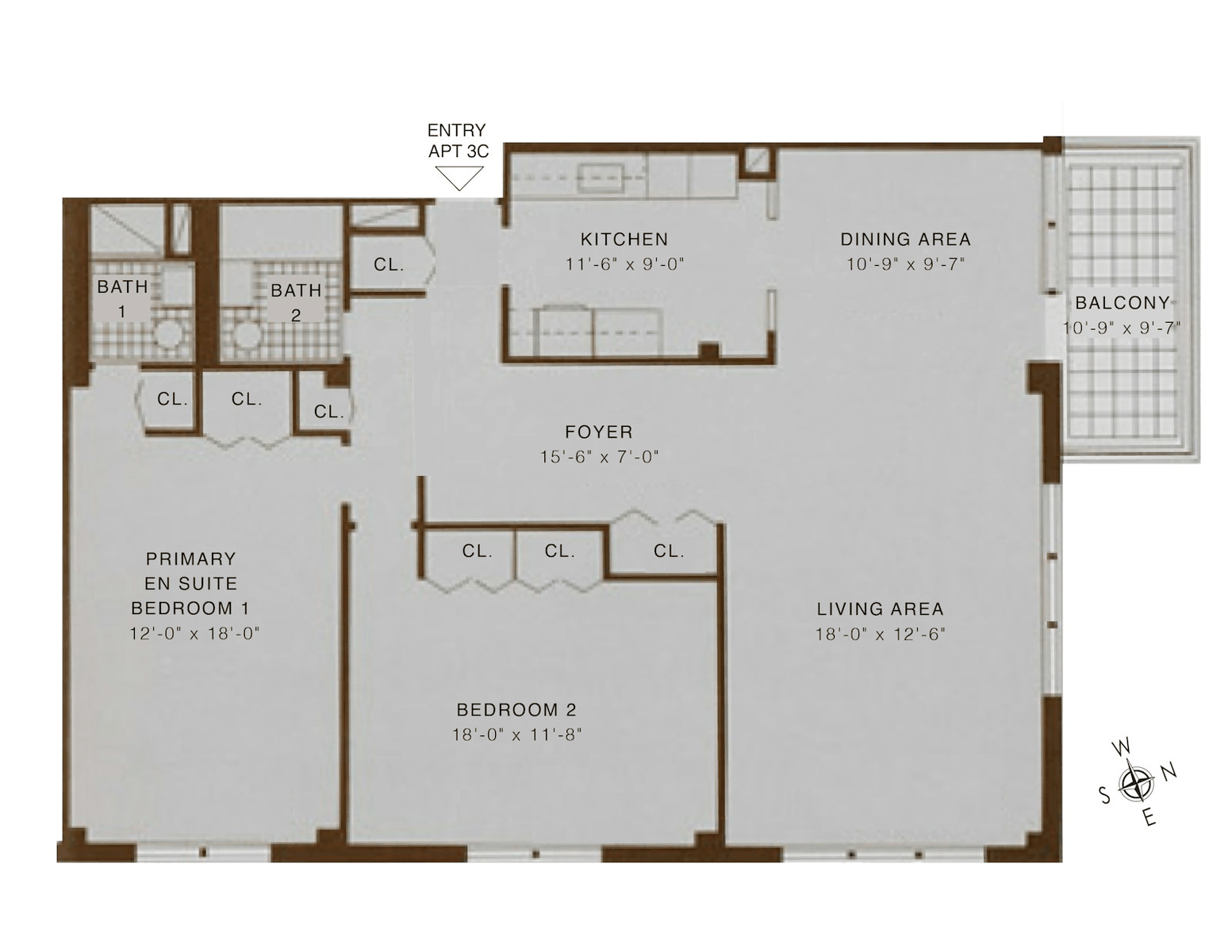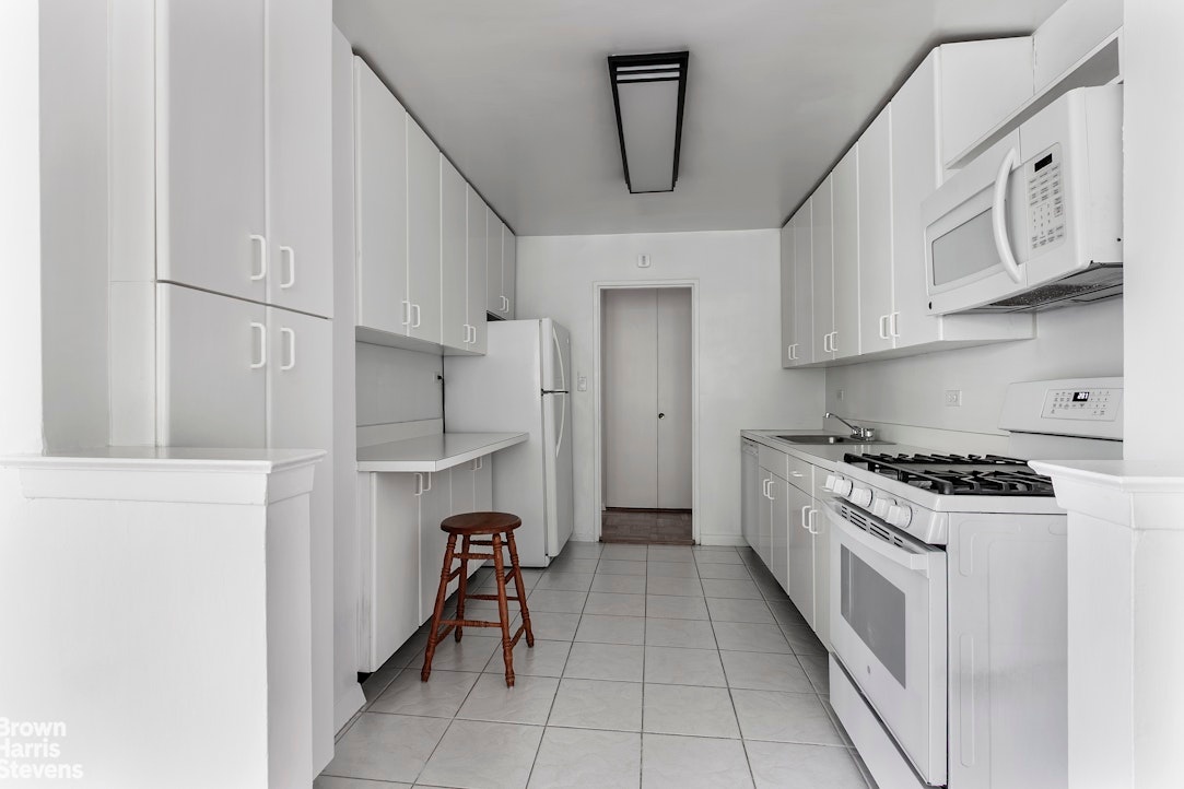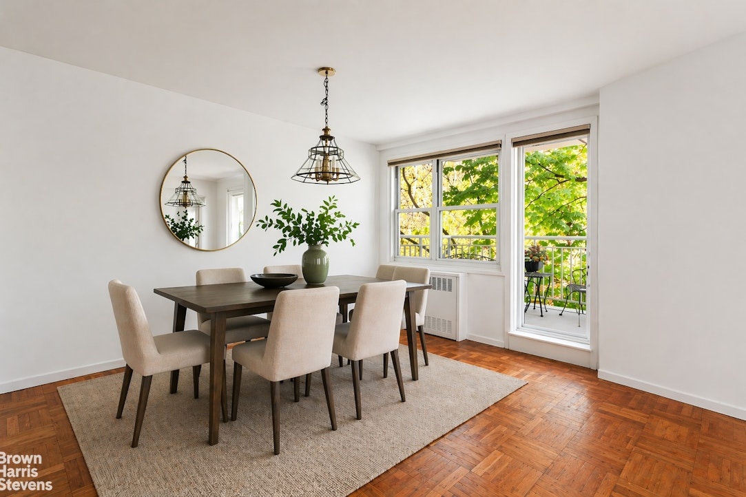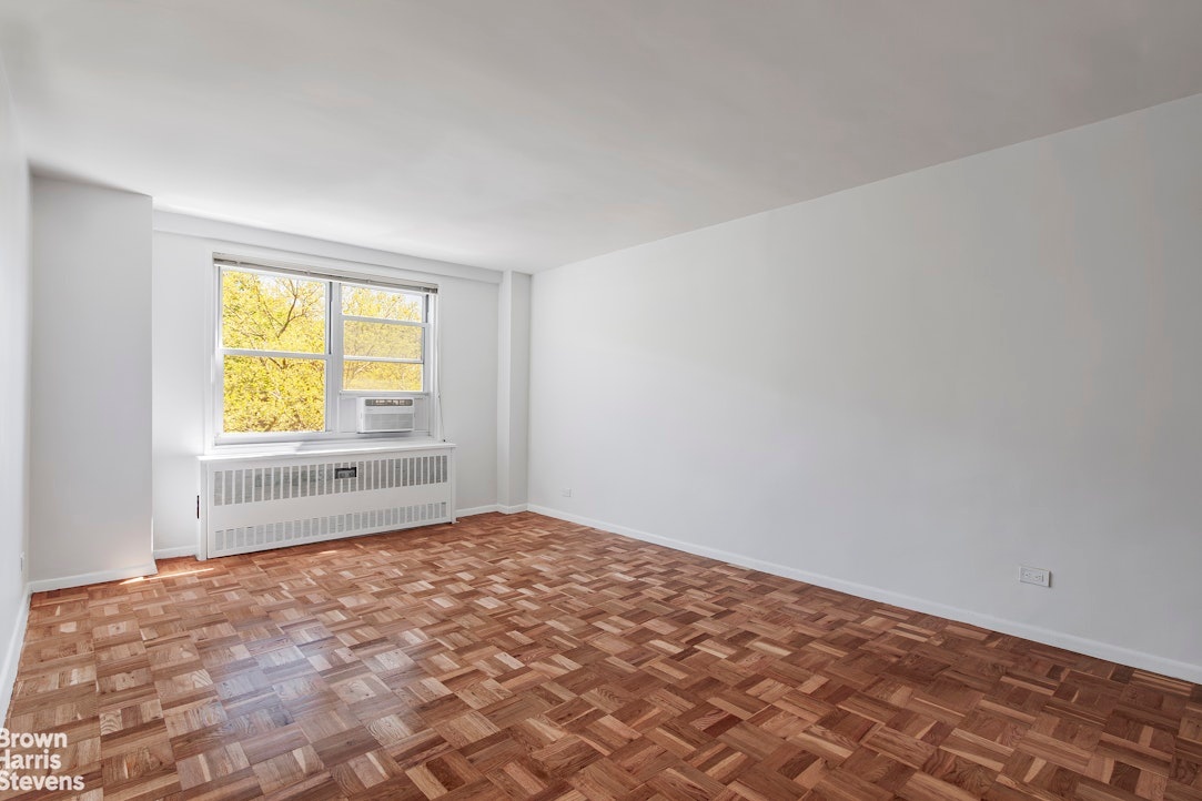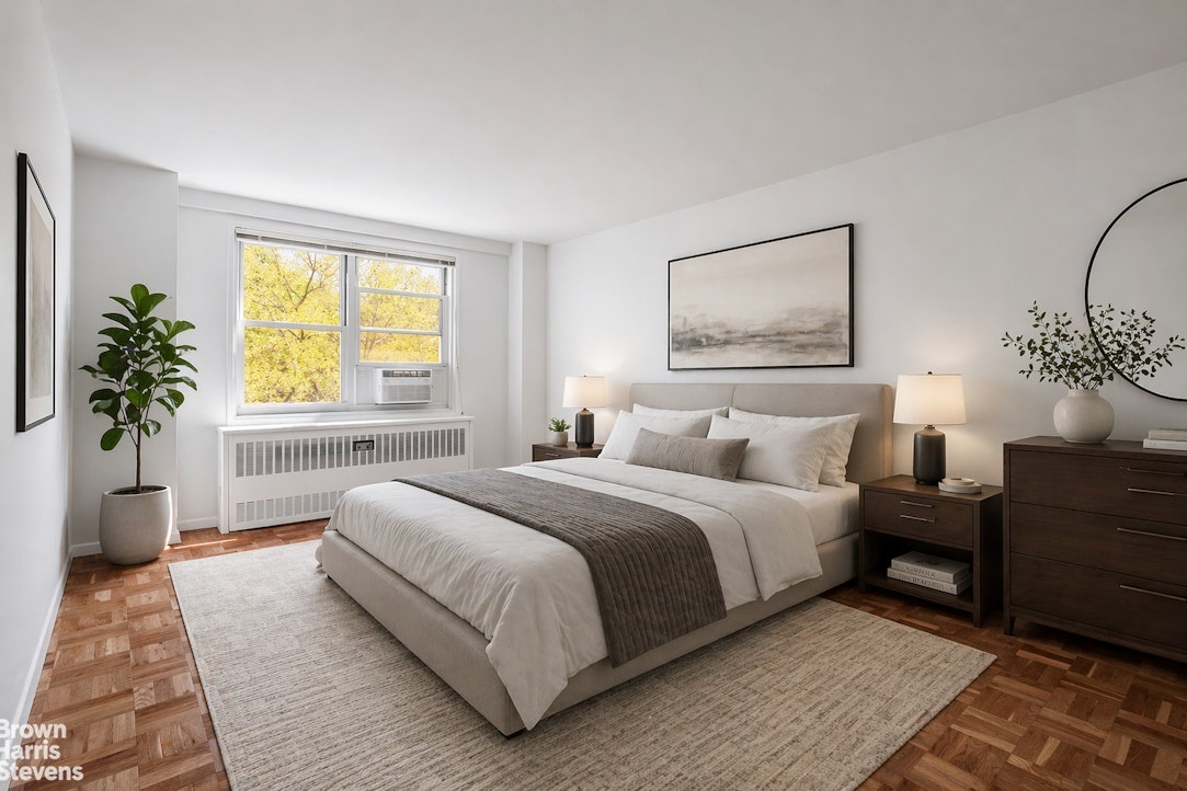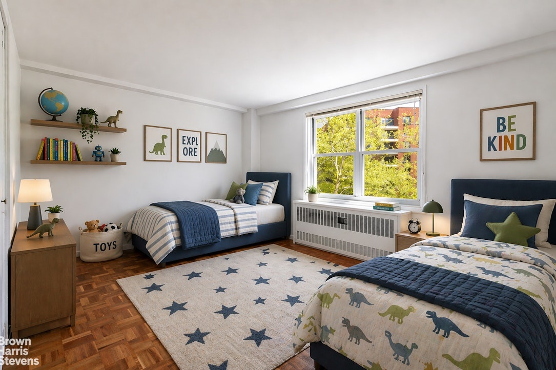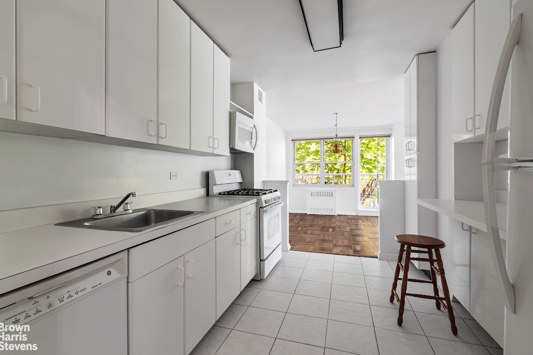 The thoughtfully designed layout features a gracious entry foyer, a spacious dining L, and a generously sized kitchen with counter seating. Two full bathrooms, including one with a shower, along with abundant closet space and classic parquet wood floors, complete the home. Both bedrooms are exceptionally large, with the potential to create a third bedroom.