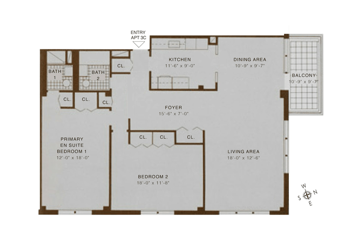 The thoughtfully designed layout features a gracious entry foyer, a spacious dining L, and a generously sized kitchen with counter seating. Two full bathrooms, including one with a shower, along with abundant closet space and classic parquet wood floors, complete the home. Both bedrooms are exceptionally large, with the potential to create a third bedroom.