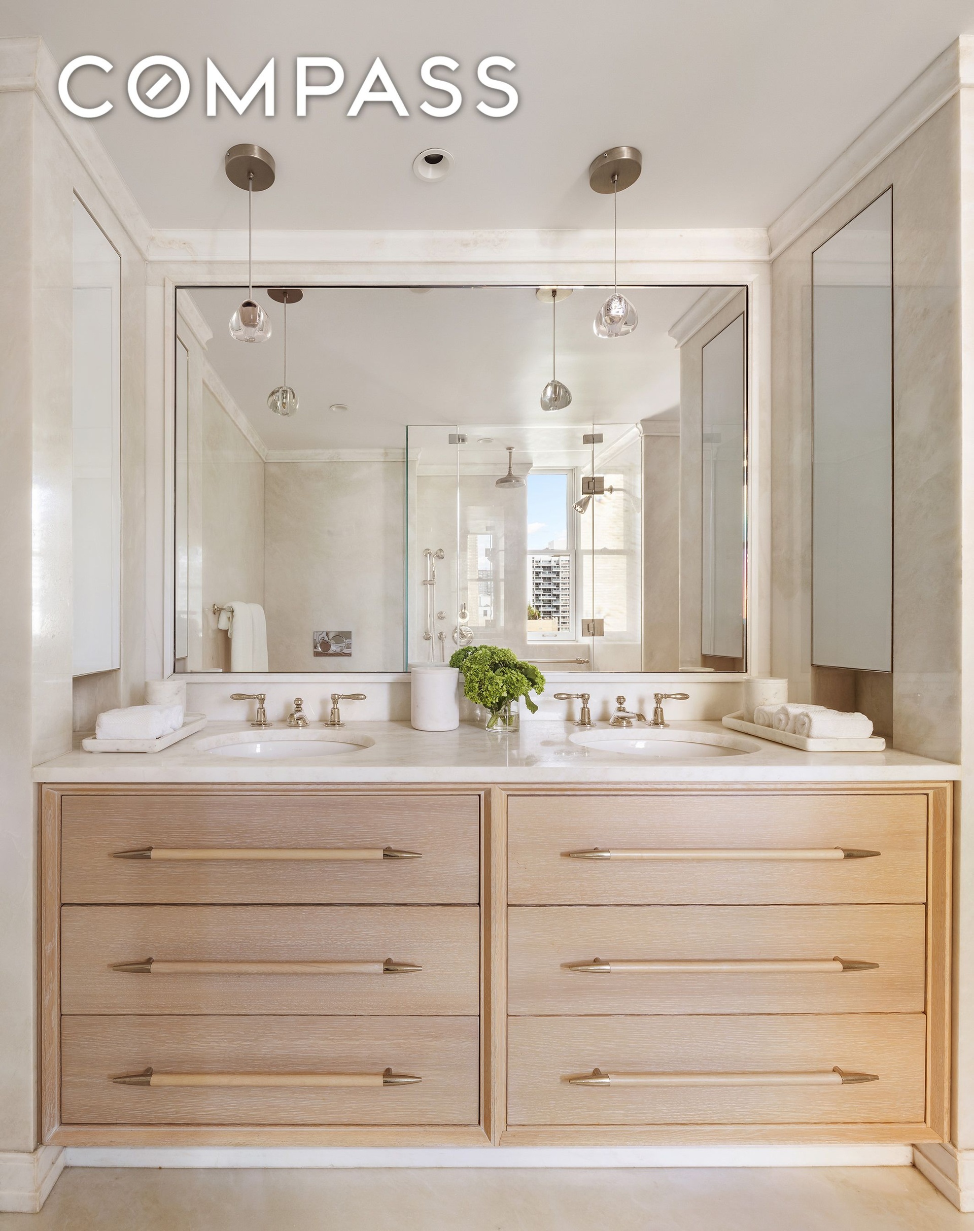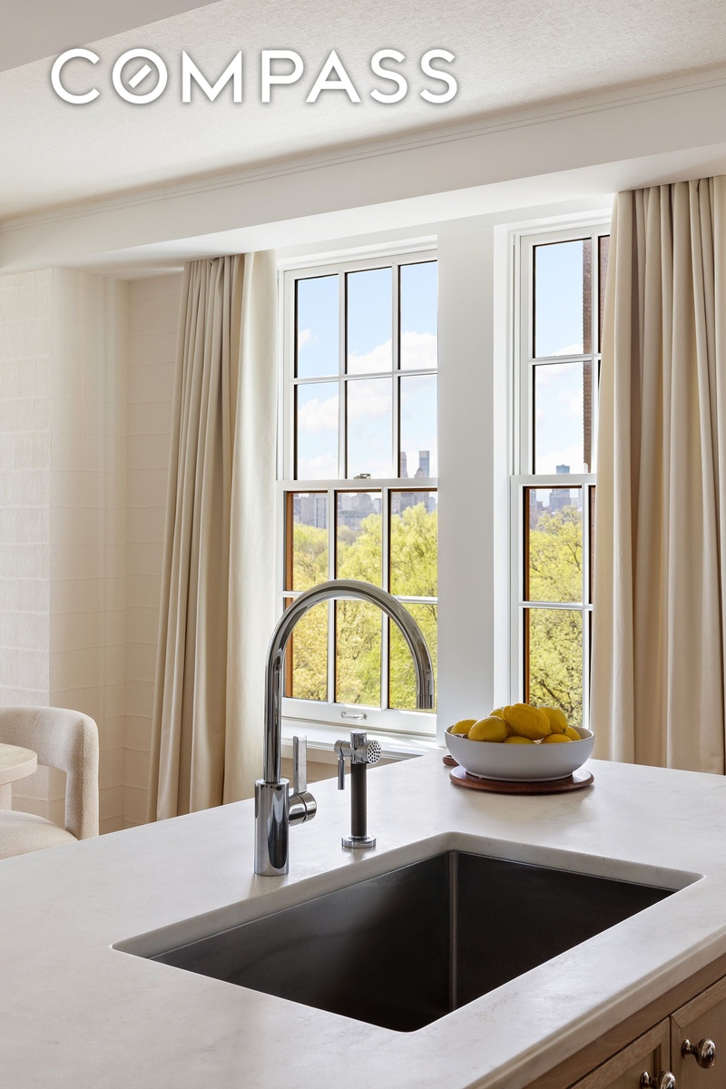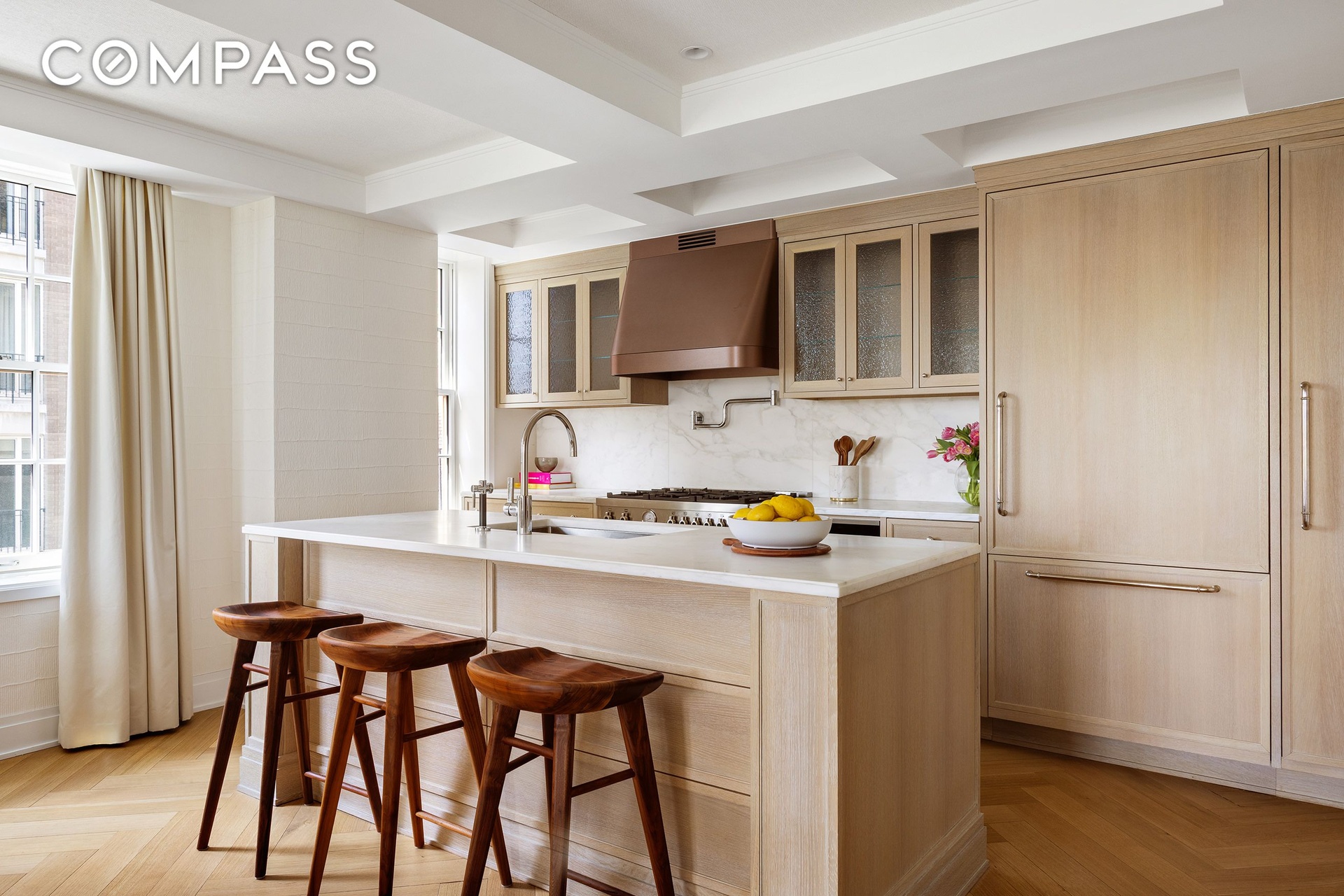 The corner living room and dining area are well proportioned, with large windows that frame peaceful views of the park and bring in an abundance of natural light throughout the day. The layout flows easily and works well for both everyday living and entertaining. The beautiful kitchen, custom designed by CetraRuddy, features marble countertops and backsplashes, Miele appliances, including a six burner gas range with pot filler, wine refrigerator, warming drawer, and a pantry for additional storage. A custom-designed Italian copper hood adds a simple, cohesive finish to the space.