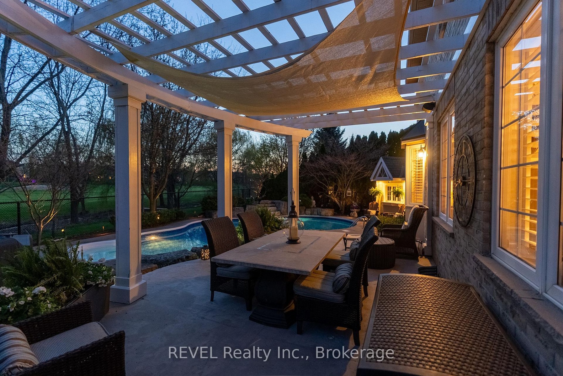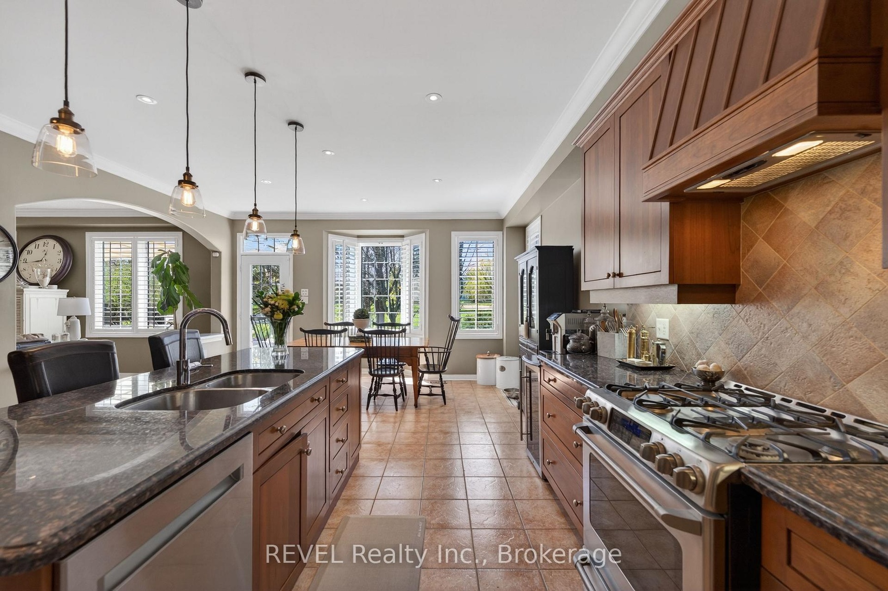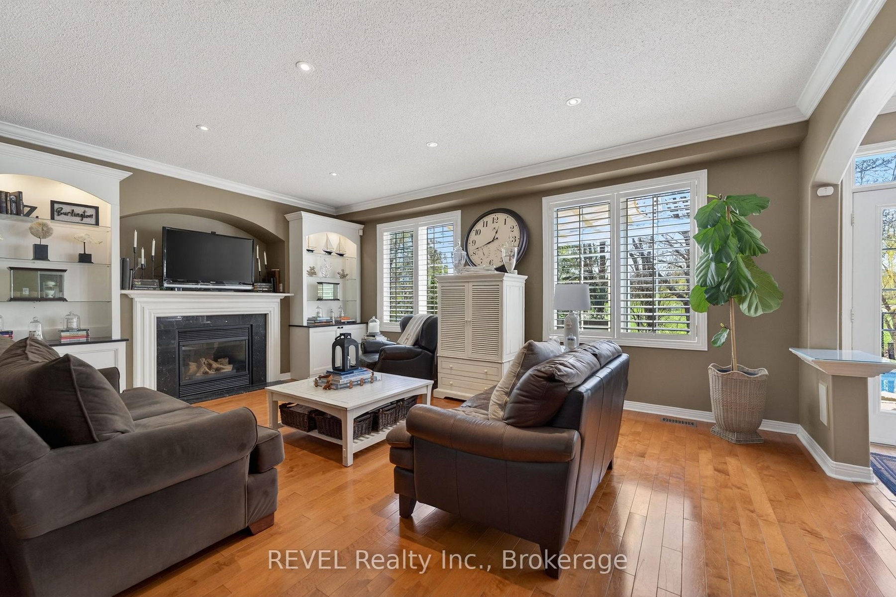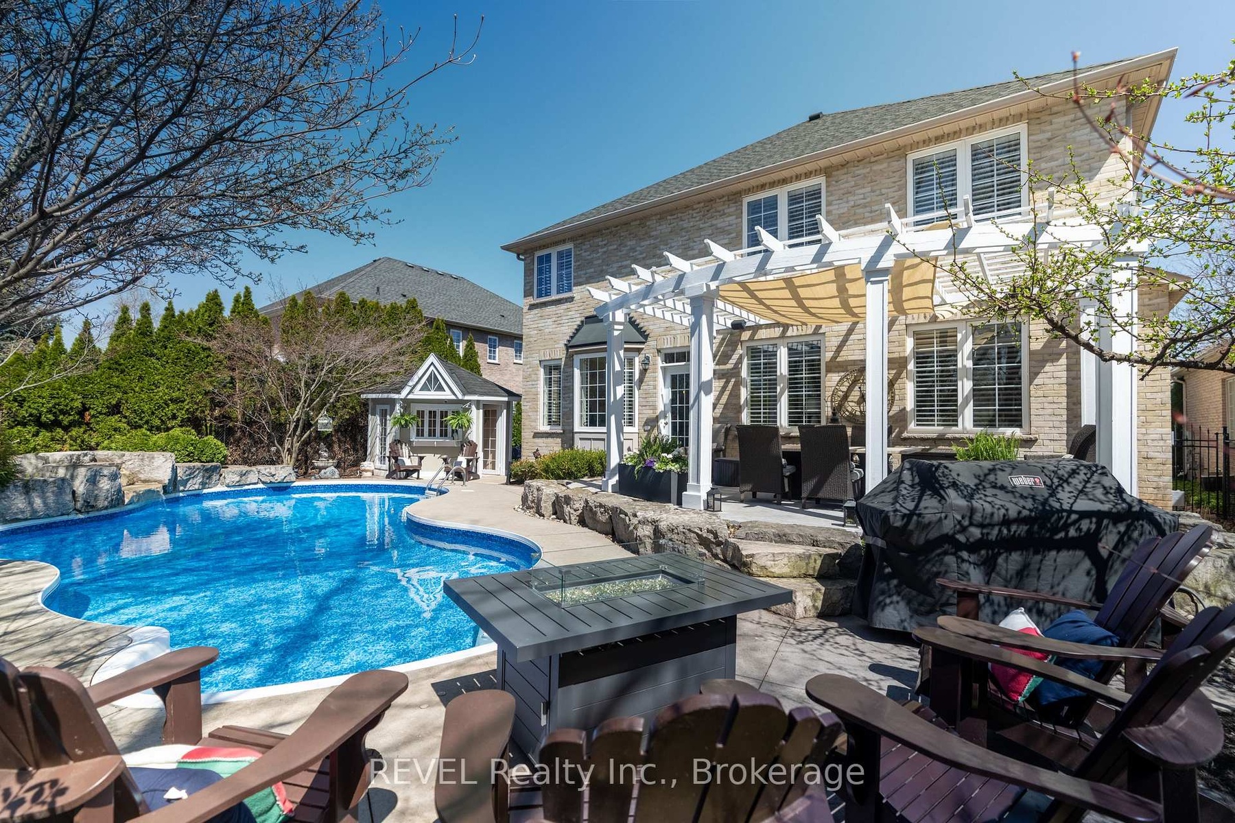 Welcome to 4266 Clubview Drive in Burlington, an exceptional home offering 3,878 sq ft above grade, set in a quiet, highly sought-after area backing directly onto Millcroft Golf Course and just a 5-minute walk to Charles Beaudoin Public School. This beautifully landscaped property features a stunning 18x34 saltwater in-ground pool with concrete surround, pergola, garden pool shed, gas BBQ line, and a covered front patio, creating the perfect outdoor retreat. Inside, the main floor showcases 10' ceilings, hardwood flooring, California wood shutters, crown molding, and a built-in sound system throughout. The spacious layout offers a formal living and dining room, a private office, and an open-concept kitchen and dinette overlooking the backyard, complete with cherry cabinetry, granite countertops, a large island with sink, and stainless steel appliances, flowing into a warm and inviting family room with gas fireplace and custom built-ins with lighting. Additional conveniences include main floor laundry, central vac, and a security system. The second level features five generously sized bedrooms, all carpeted, with two Jack and Jill bathrooms plus a luxurious primary suite with a 5-piece ensuite including a large tub, glass walk-in shower, double sinks, and his and hers walk-in closets. The fully finished basement offers laminate flooring, a sixth bedroom, full bathroom, spacious rec room with gas fireplace and built-ins with lighting, and a wet bar with fridge, perfect for entertaining. With a 3-car attached garage, 200 amp service, and double staircases to both the upper and lower levels, this home combines function, space, and elegance, all just minutes to amenities and quick access to Highway 403.