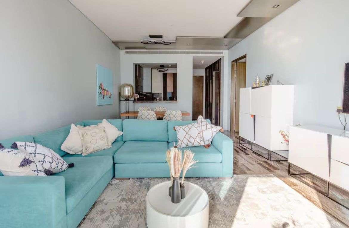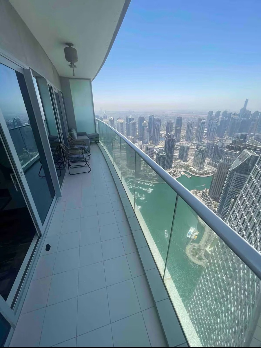 The apartment features a bright and expansive living and dining area complemented by floor-to-ceiling windows, allowing abundant natural light and showcasing breathtaking views of the Marina skyline and Arabian Gulf. The open-plan kitchen is fitted with high-quality cabinetry and premium finishes, seamlessly blending functionality with modern design.