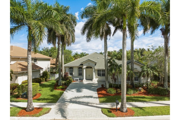 Located in the gated Hunters Pointe subdivision of Weston Hills, this one-story 4BR/2.5BA home offers an open floor plan with seamless indoor-outdoor flow. The updated kitchen features quartz countertops and LG appliances, opening to main living areas ideal for everyday living/entertaining. Accordion shutters provide full hurricane protection. Enjoy a private backyard with pool and patio designed for relaxation and gatherings. Additional features include a 2-car garage and paver driveway with ample parking. Roof replaced 2021 and A/C in 2022. Hunters Pointe offers a park with basketball, playground and soccer, and optional country club amenities include tennis, fitness center, and two golf courses. Conveniently located near parks, top-rated schools, dining and major highways. Easy to show.
