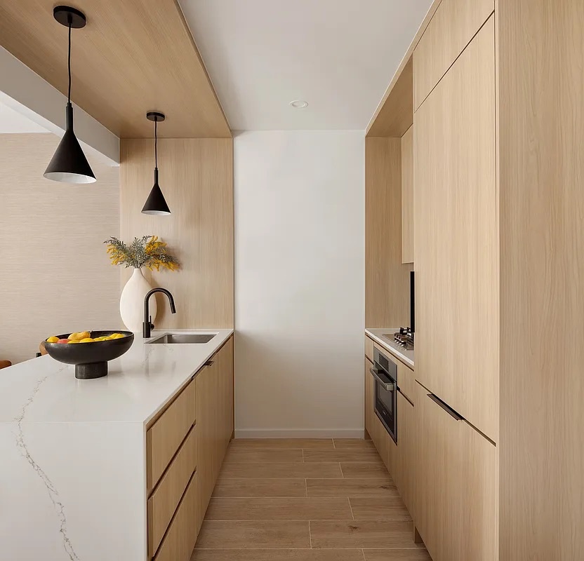 The chef-inspired kitchen is both refined and functional, featuring a suite of fully integrated Bosch appliances, elegant Porcelanosa quartz countertops, fully ventilated range hood, and custom cabinetry with built-in accent lighting — ideal for everyday living and entertaining alike.