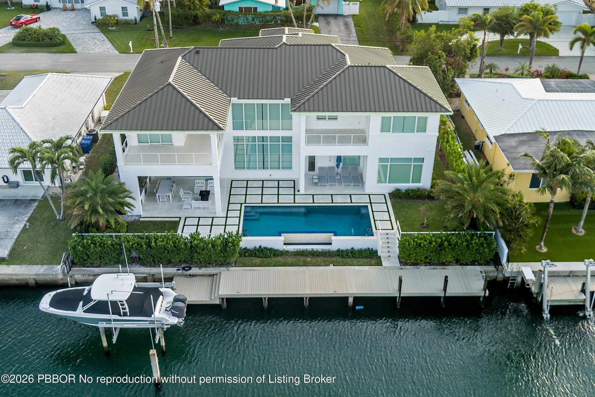This new construction waterfront residence, completed in 2023, is set on a 100 x 110 lot with 100 feet of water frontage, a private dock, and views of both the canal and Intracoastal.