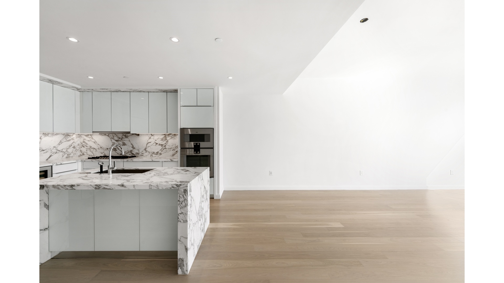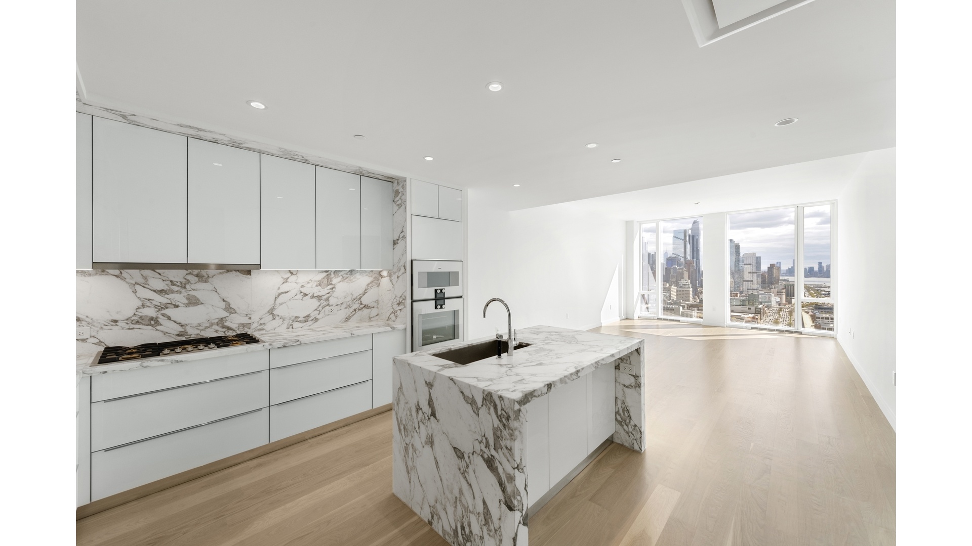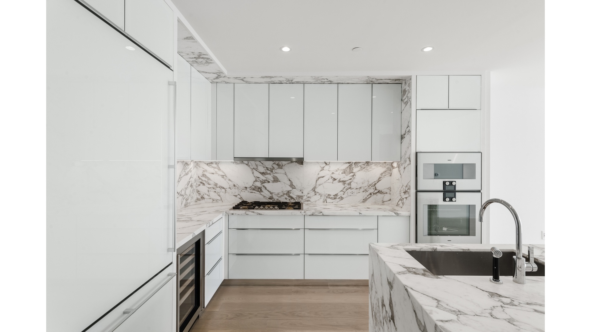 An open kitchen extends into a large living room and creates a beautiful space for meals or entertaining guests. Modern kitchen is designed by Pedin with Gaggenau appliances and polished chrome Dornbracht fixtures. It also comes with fully-vented range hoods, wine refrigerators and garbage disposal.