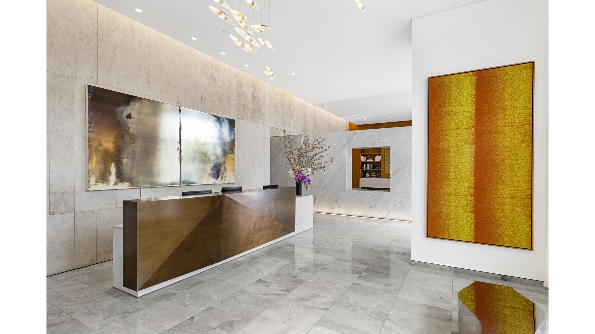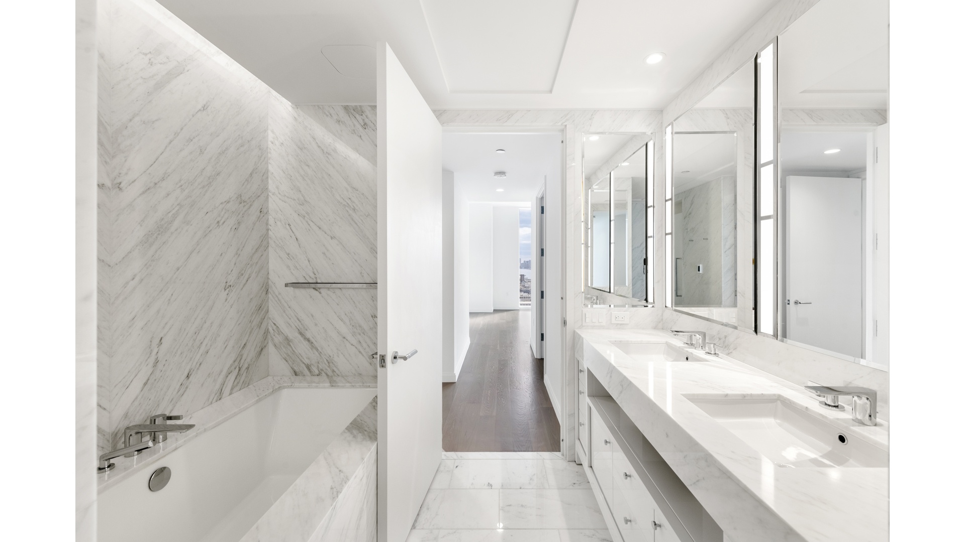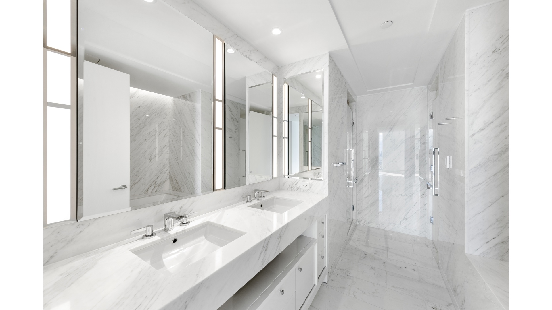 The Primary bedroom suite's expansive windows have been upgraded with motorized blackout and solar shades. The ensuite spa-like marble bathroom is enhanced with radiant heated floors with rain shower, double sinks, deep soaking bathtub, and self-closing drawers. Every closet in the unit has a new custom-designed system to maximize storage. Living room, second, and third bedrooms also have motorized solar shades. The unit comes with a new washer and fully-vented dryer.