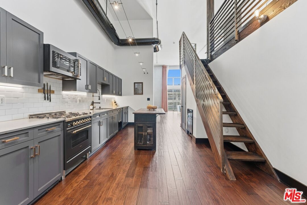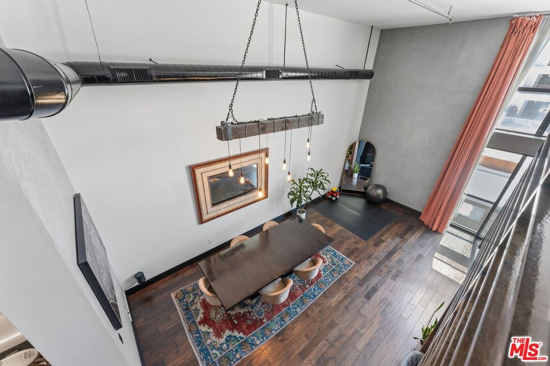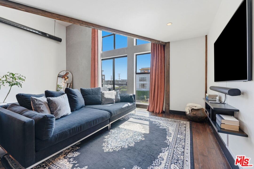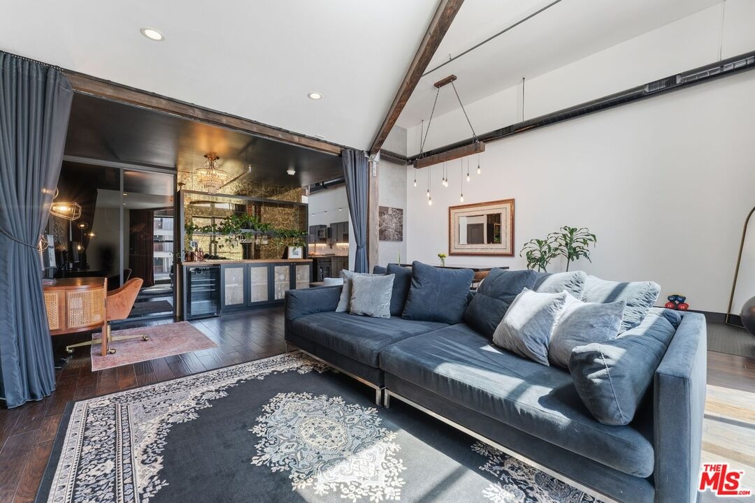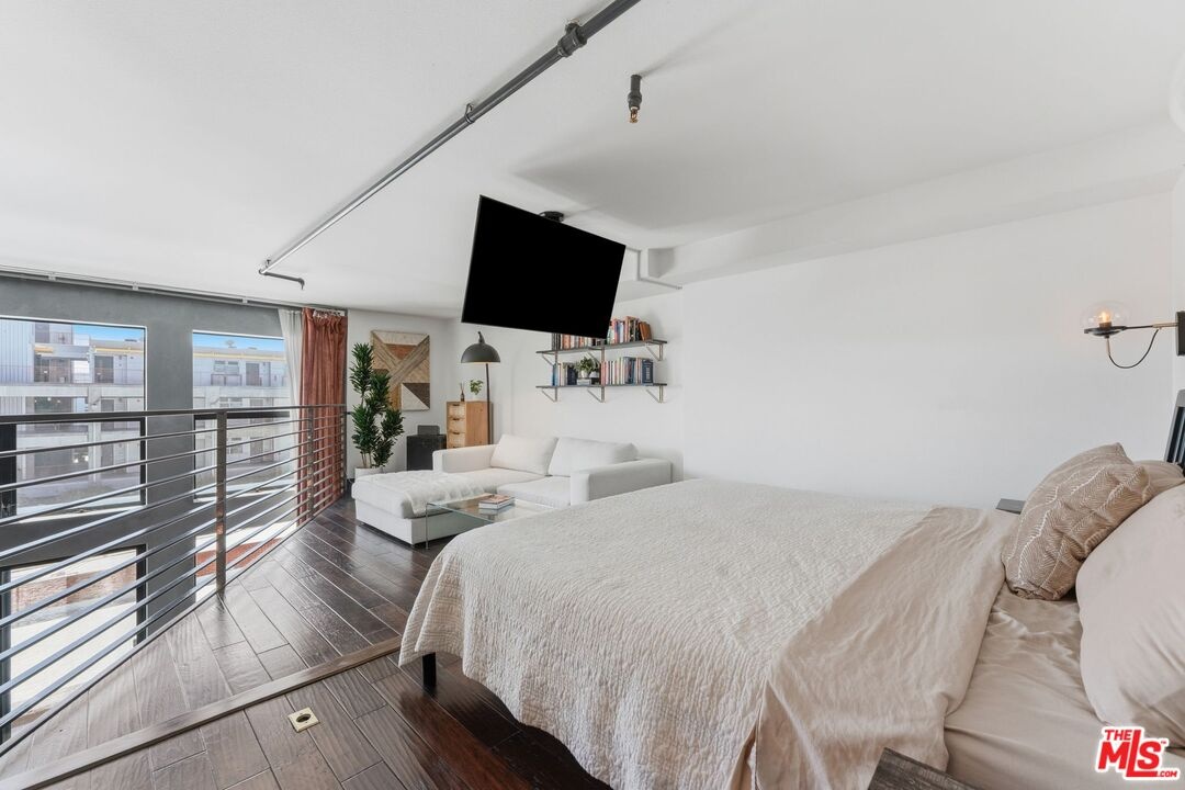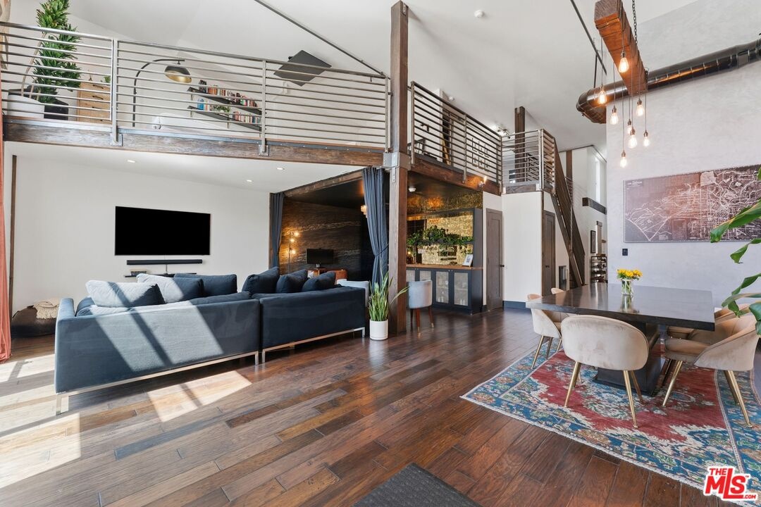 The ultimate in loft style living - this is the one you've been waiting for. Welcome to this stunning, remodeled top-floor loft an entertainer's dream set in one of the Marina's most vibrant and creative pockets. Dramatic 17+ foot ceilings and a wall of floor-to-ceiling windows flood the space with natural light, creating a bright, open atmosphere enhanced by custom drapery for a true designer finish. The open-concept layout is both functional and striking, featuring a custom speakeasy-style bar perfect for entertaining or unwinding in style. The kitchen is a showpiece, outfitted with sleek quartz countertops and premium appliances including a Viking Pro refrigerator, Ilve range, and Fisher & Paykel dishwasher. Both bathrooms have been thoughtfully elevated with copper sinks, marble counters, custom tile work, smart mirror lighting, and Toto bidet toilets. The main level offers a private guest suite with en-suite bath, while the upstairs mezzanine features a spacious primary retreat complete with a walk-in closet, room for a home office, and architectural views that enhance the loft's unique character. Additional highlights include new HVAC (2024), custom cabinetry and doors, upgraded lighting throughout, EV charging, guest parking, and access to a community rooftop deck with sweeping city views. located in a highly walkable neighborhood just moments from shops, parks, restaurants, and the beach offering the ultimate blend of convenience and coastal lifestyle.