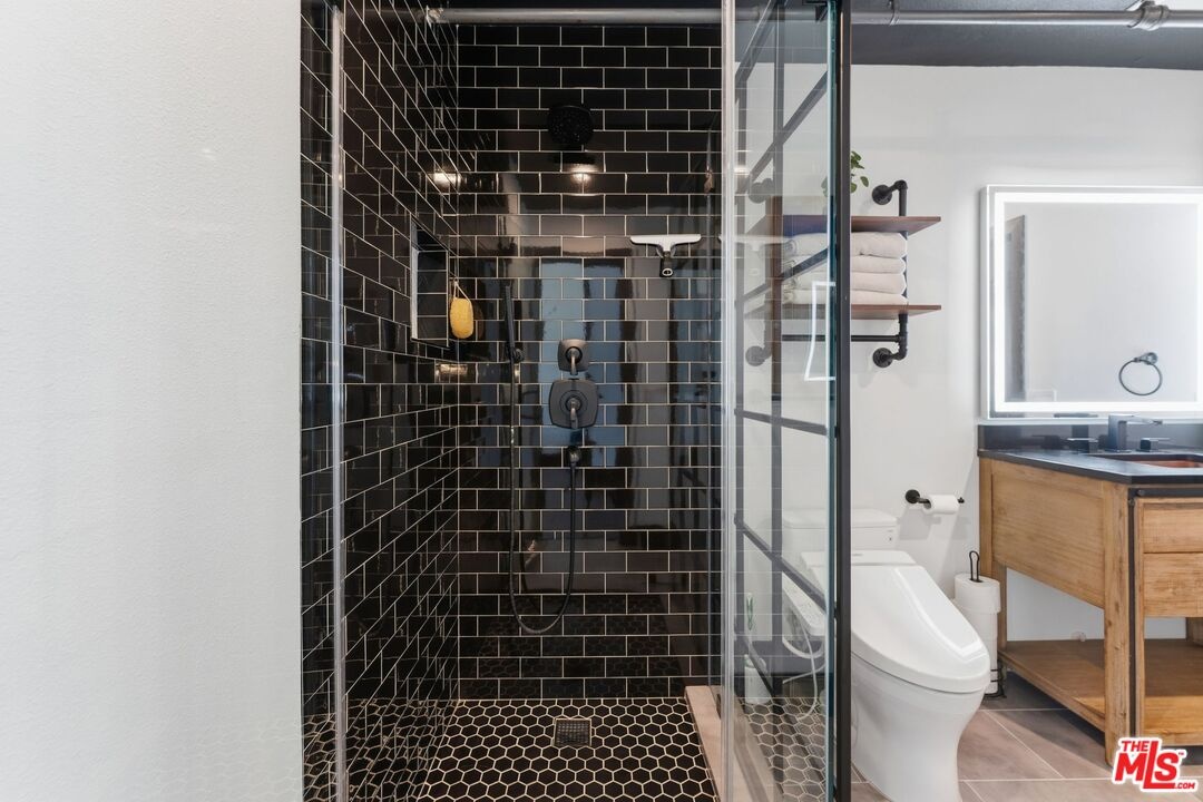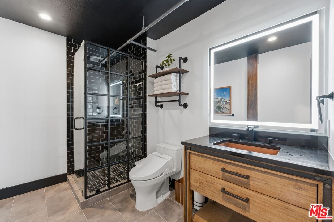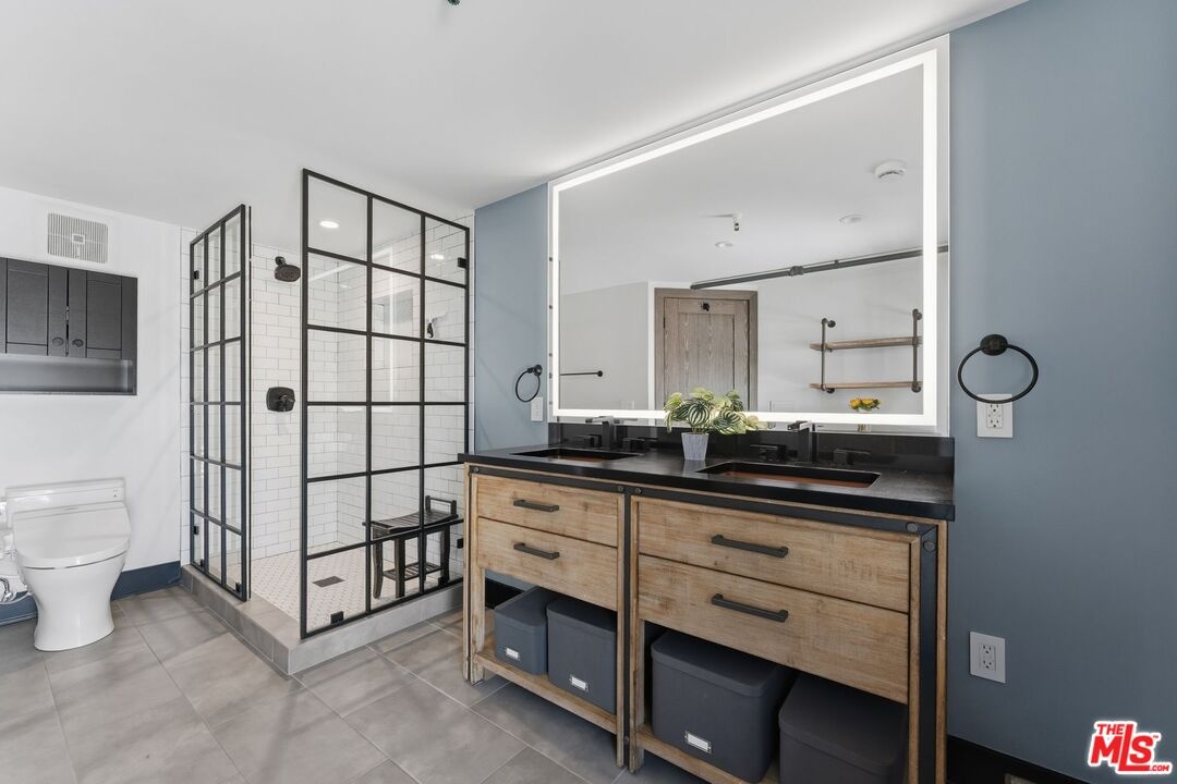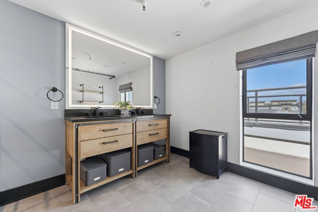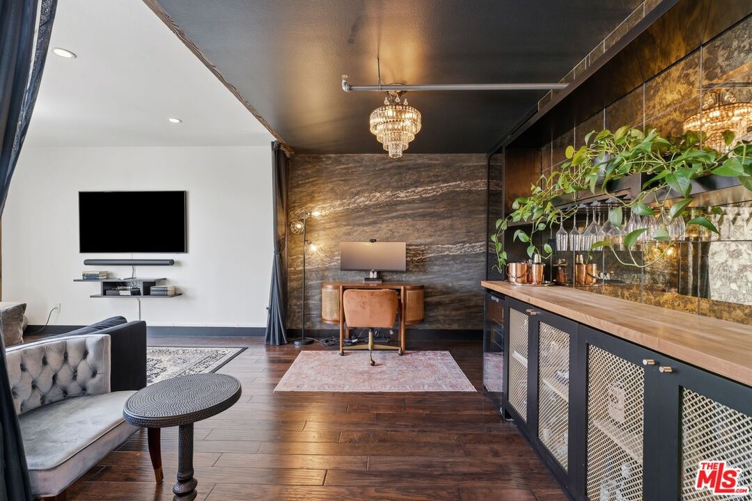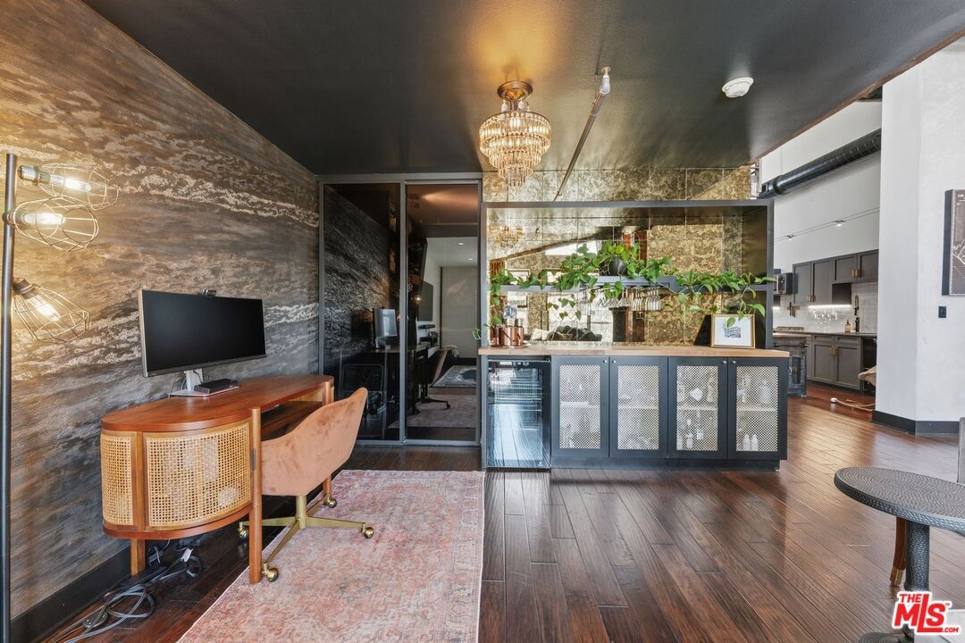 The ultimate in loft style living - this is the one you've been waiting for. Welcome to this stunning, remodeled top-floor loft an entertainer's dream set in one of the Marina's most vibrant and creative pockets. Dramatic 17+ foot ceilings and a wall of floor-to-ceiling windows flood the space with natural light, creating a bright, open atmosphere enhanced by custom drapery for a true designer finish. The open-concept layout is both functional and striking, featuring a custom speakeasy-style bar perfect for entertaining or unwinding in style. The kitchen is a showpiece, outfitted with sleek quartz countertops and premium appliances including a Viking Pro refrigerator, Ilve range, and Fisher & Paykel dishwasher. Both bathrooms have been thoughtfully elevated with copper sinks, marble counters, custom tile work, smart mirror lighting, and Toto bidet toilets. The main level offers a private guest suite with en-suite bath, while the upstairs mezzanine features a spacious primary retreat complete with a walk-in closet, room for a home office, and architectural views that enhance the loft's unique character. Additional highlights include new HVAC (2024), custom cabinetry and doors, upgraded lighting throughout, EV charging, guest parking, and access to a community rooftop deck with sweeping city views. located in a highly walkable neighborhood just moments from shops, parks, restaurants, and the beach offering the ultimate blend of convenience and coastal lifestyle.