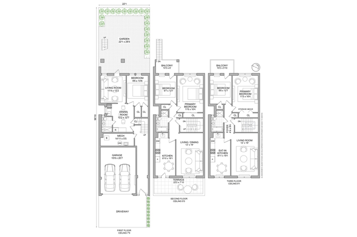 - Second Floor: Spacious two-bedroom, one-bath residence featuring a front-facing terrace, a balcony, and direct access to the shared rear garden.
